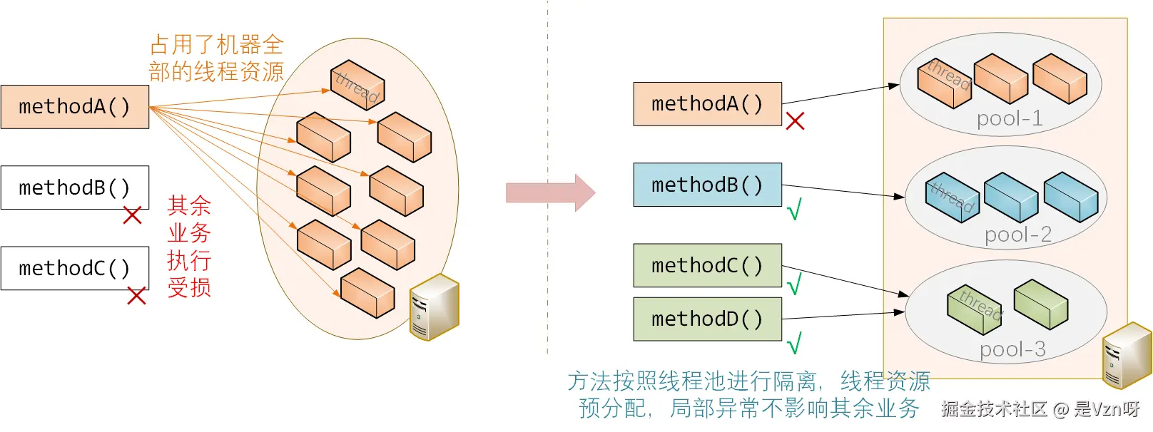 为了应对这种情况,可以基于线程池进行隔离设计,为主要业务处理方法指定对应的执行线程池,限定具体业务方法仅可以按照分配线程池提供的线程资源进行调度与使用,禁止业务方法自行无度占用系统的线程与CPU执行资源。这样一来,即使某个业务占用了自己全部线程池资源,依旧不会影响到其余线程池的正常处理,保障了其余业务的正常开展。