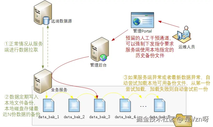 所以呢,如果在规划阶段,在上述实现的几点保障措施的基础上,再额外规划一条人工指令干预通道,在紧急情况下,可以人工下发指令,强制要求系统断开与服务端的实时更新逻辑,并强制加载第X份本地备份文件,便可以快速让自身服务摆脱远端数据源的故障影响,等到其故障修复后,再下发指令恢复对远端数据源的实时更新。改造后的示意图如下所示: