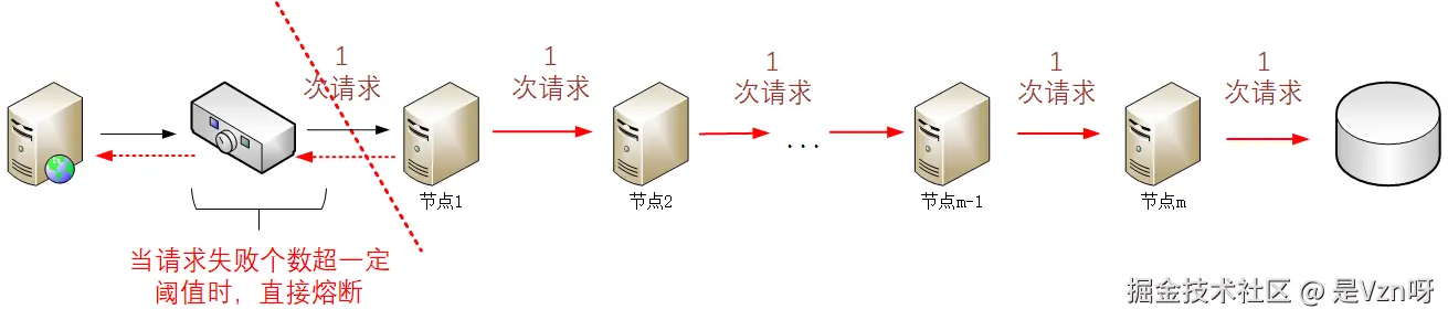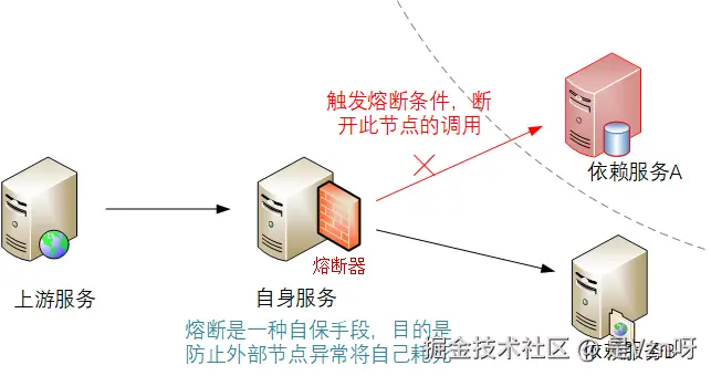 同样道理,在软件实现中,也有类似电路保险丝一般的设计思路,通过在服务的对外请求调用处增加熔断器,当符合预设条件时,就会将对应依赖的服务从自身的请求链路中剔除,来避免自身节点耗费大量的资源在等待一个大概率错误的响应。