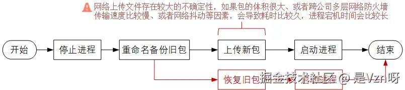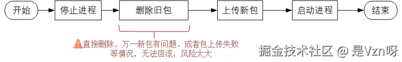 - 如果包的体积很大、或者上传的时候要走vpn、堡垒机等层层关卡,可能速度会比较慢,整个传输过程的耗时会很长。这种情况下,可能会导致线上进程停机时间太久。