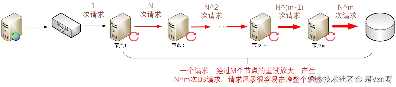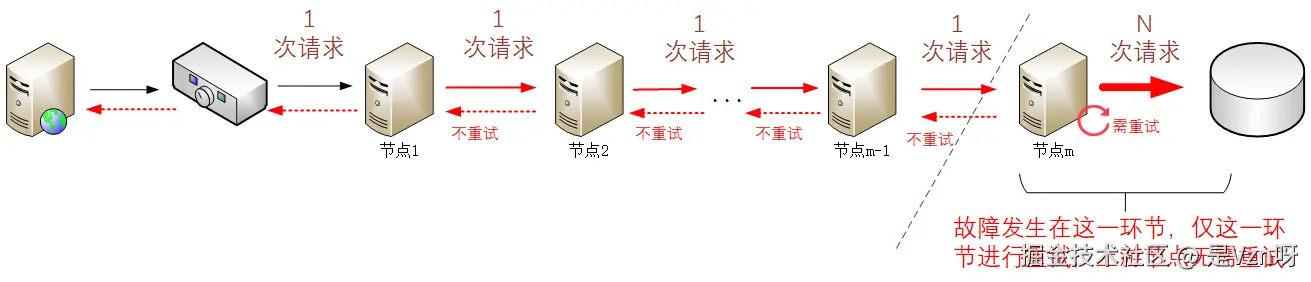 此外,在一个较长的处理链路上,如果涉及到重试的环节过多,还需要考虑引发请求风暴的风险。比如下图的场景,假定重试的最大次数限制为N: