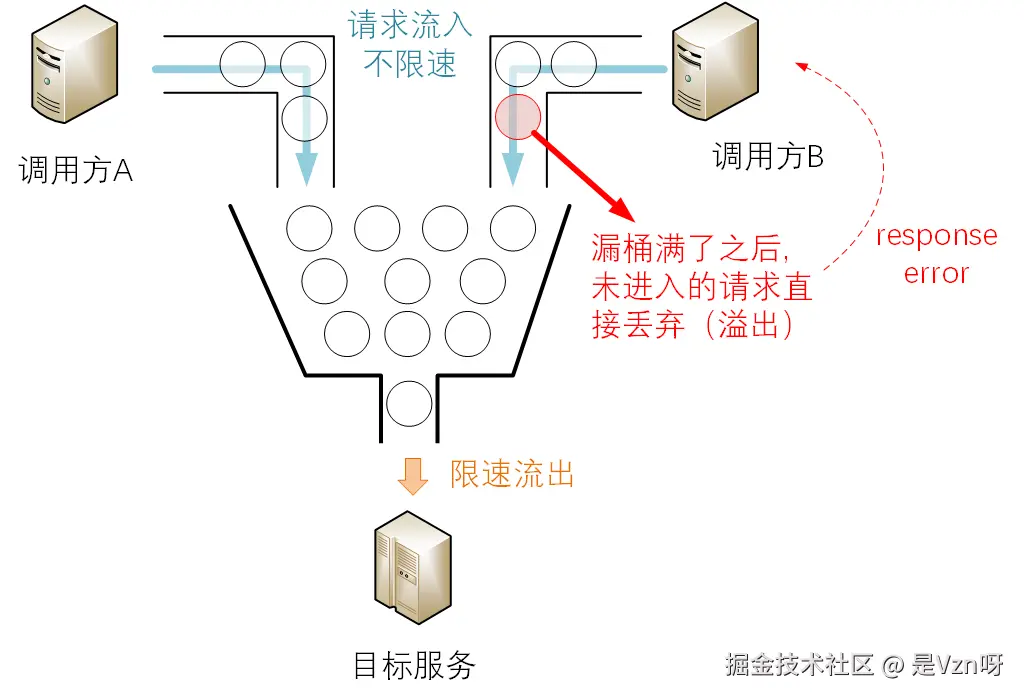 漏桶算法的原理很简单,它不限制流入的请求量,但是会以一个相对受限的速度从漏桶中获取请求进行消费处理,如果流出速度小于流入速度,请求就会在漏桶中积压暂存等待顺序被处理,一旦漏桶容量被积压的请求撑满,便会发生溢出,无法进入漏桶的请求将被丢弃。