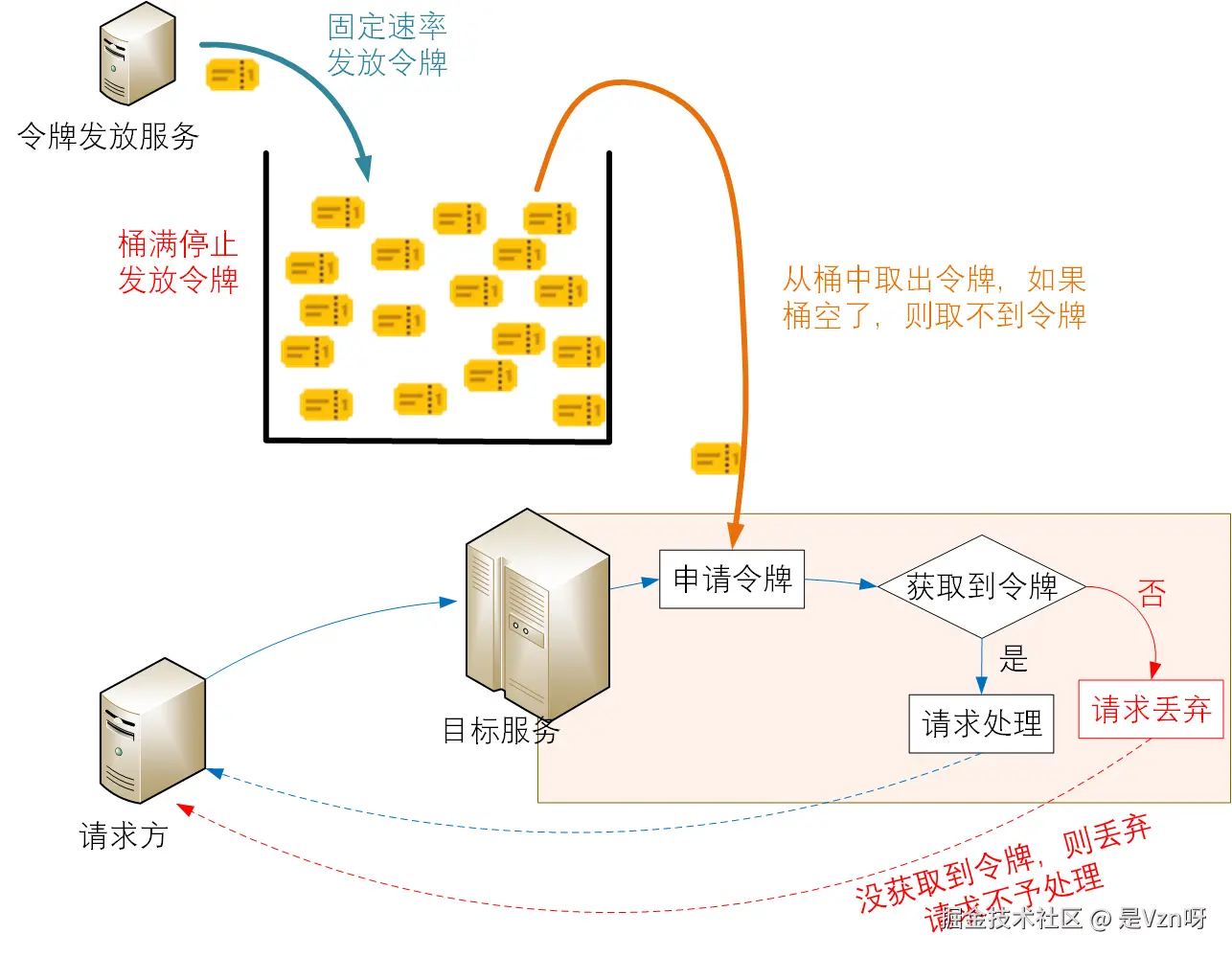 令牌桶的逻辑与漏桶略有不同,它会有个令牌发放模块负责匀速生成令牌并放入到令牌桶中,然后每次请求处理前先尝试获取一个令牌,只有获取到令牌了才会去处理对应的请求。
