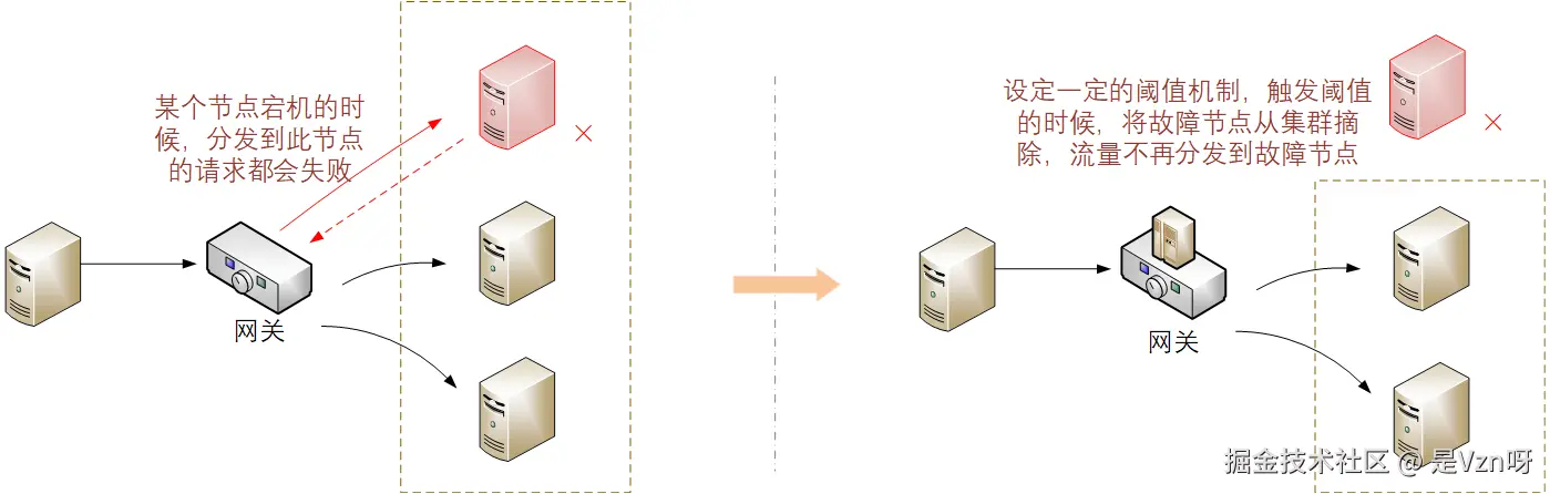 此外,在集群部署环境下,网关节点也经常会将熔断作为基础功能进行提供,实现比服务熔断更细粒度的一种控制,当服务集群中某个节点出现故障时,直接将该节点剔出集群,待其恢复之后再加入到集群中。