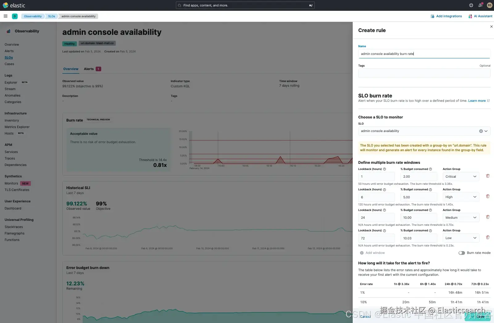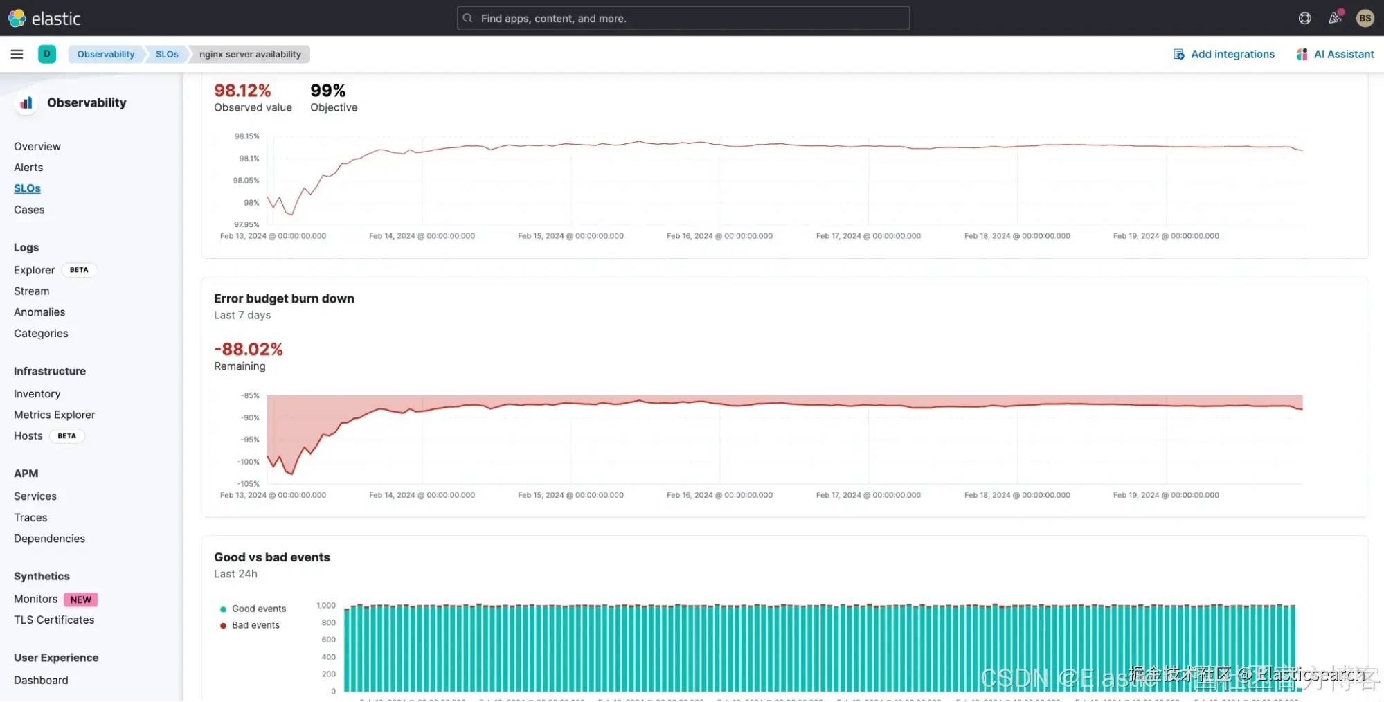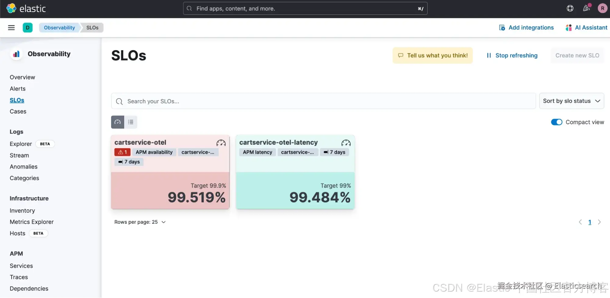 - 基于 APM 服务的 SLO 易于创建和管理,并可与 Elastic APM 集成。我们还使用 OTel 遥测来帮助监控 SLO。
