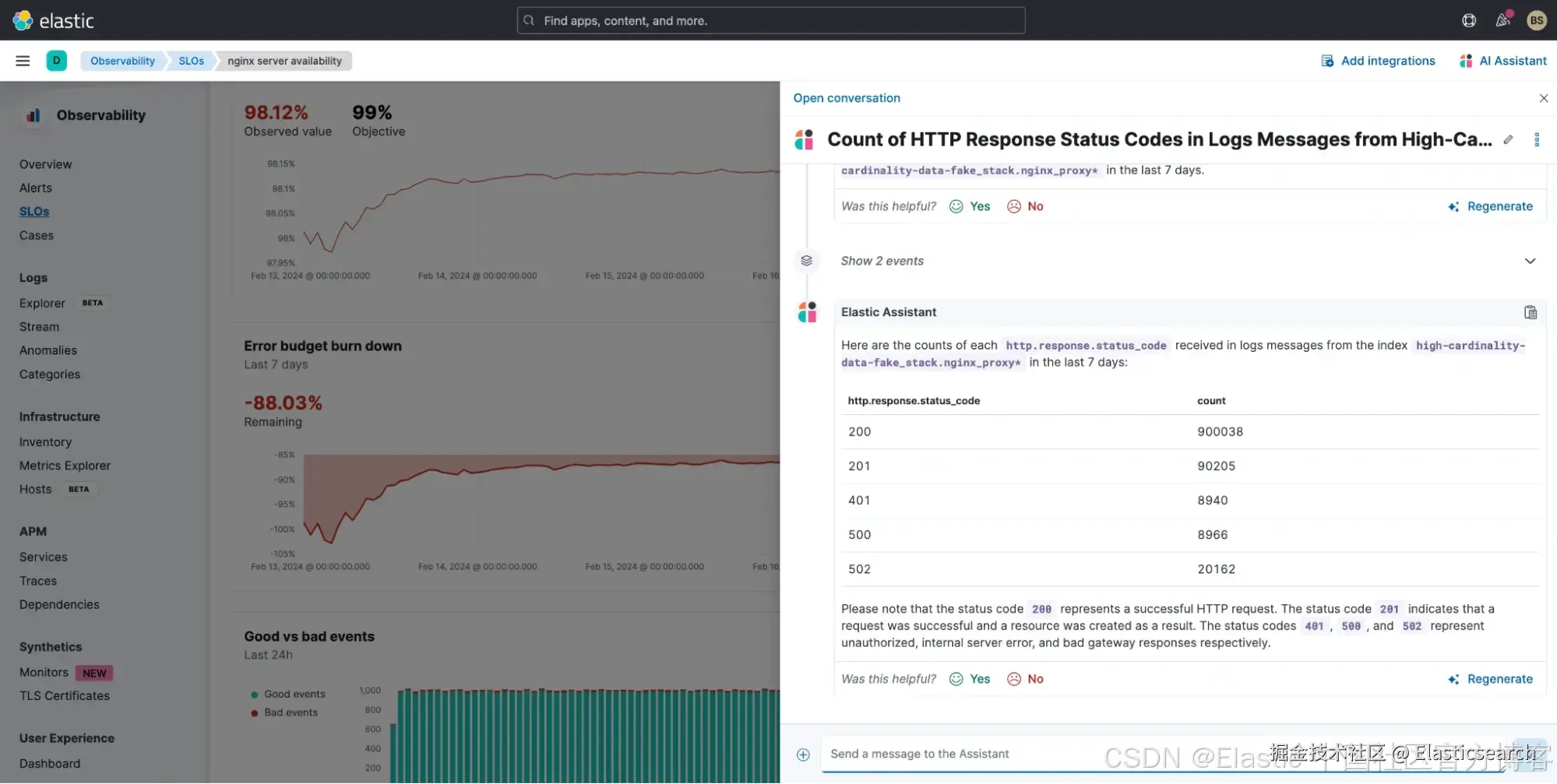 为了帮助管理运营和业务指标,Elastic Observability 的 SLO(Service Level Objectives - 服务级别目标)功能于 8.12 版中推出。本博客将介绍此功能以及如何将其与 Elastic 的 AI Assistant 配合使用以满足 SLOs。