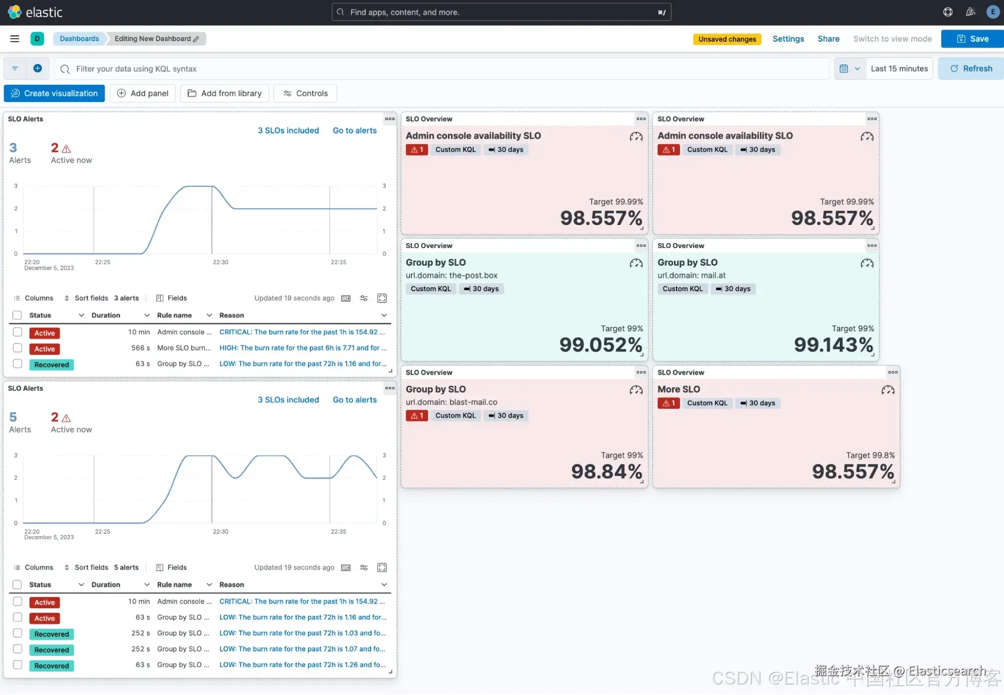 为了帮助管理运营和业务指标,Elastic Observability 的 SLO(Service Level Objectives - 服务级别目标)功能在 8.12 中引入。此功能允许为服务设置可衡量的性能目标,例如可用性、延迟、流量、错误和饱和度,或者定义你自己的目标。关键组件包括: