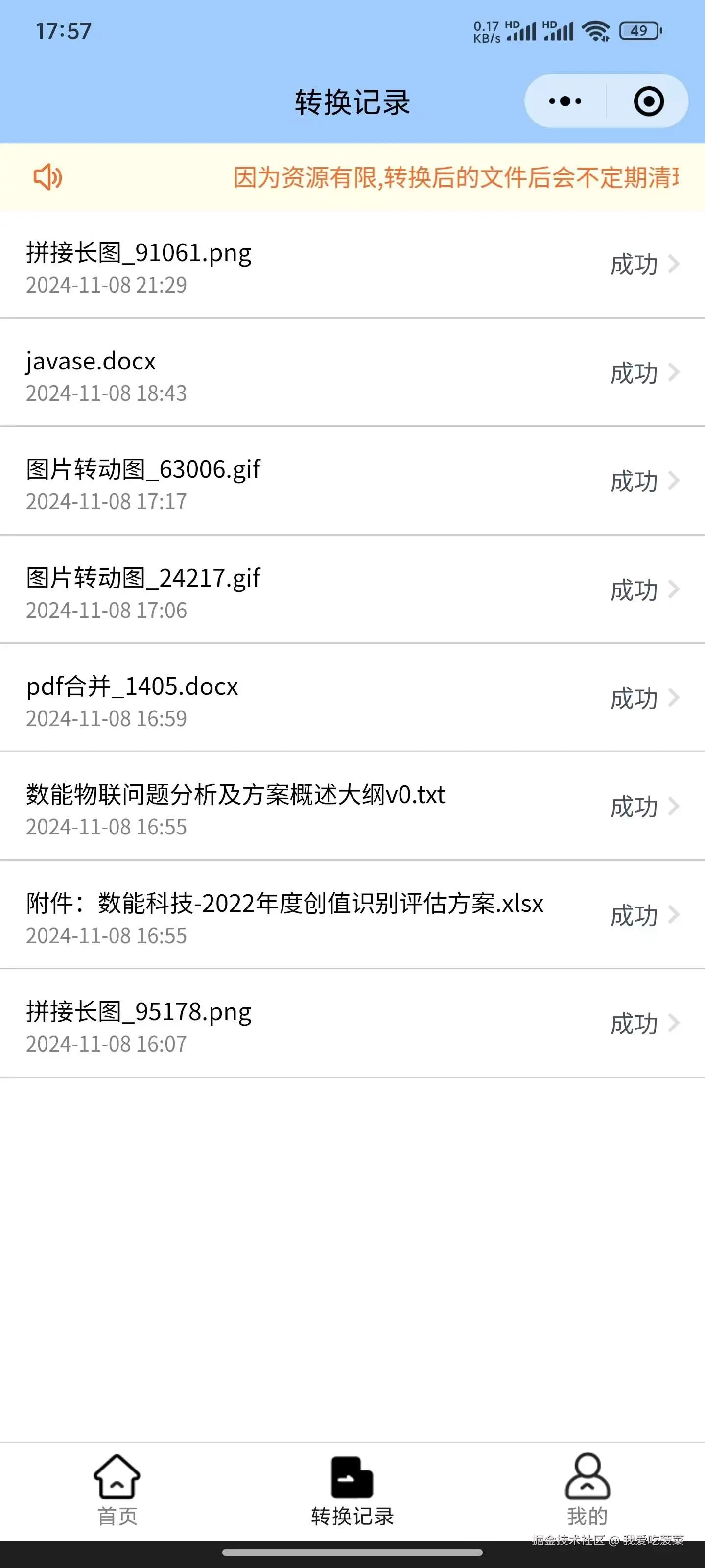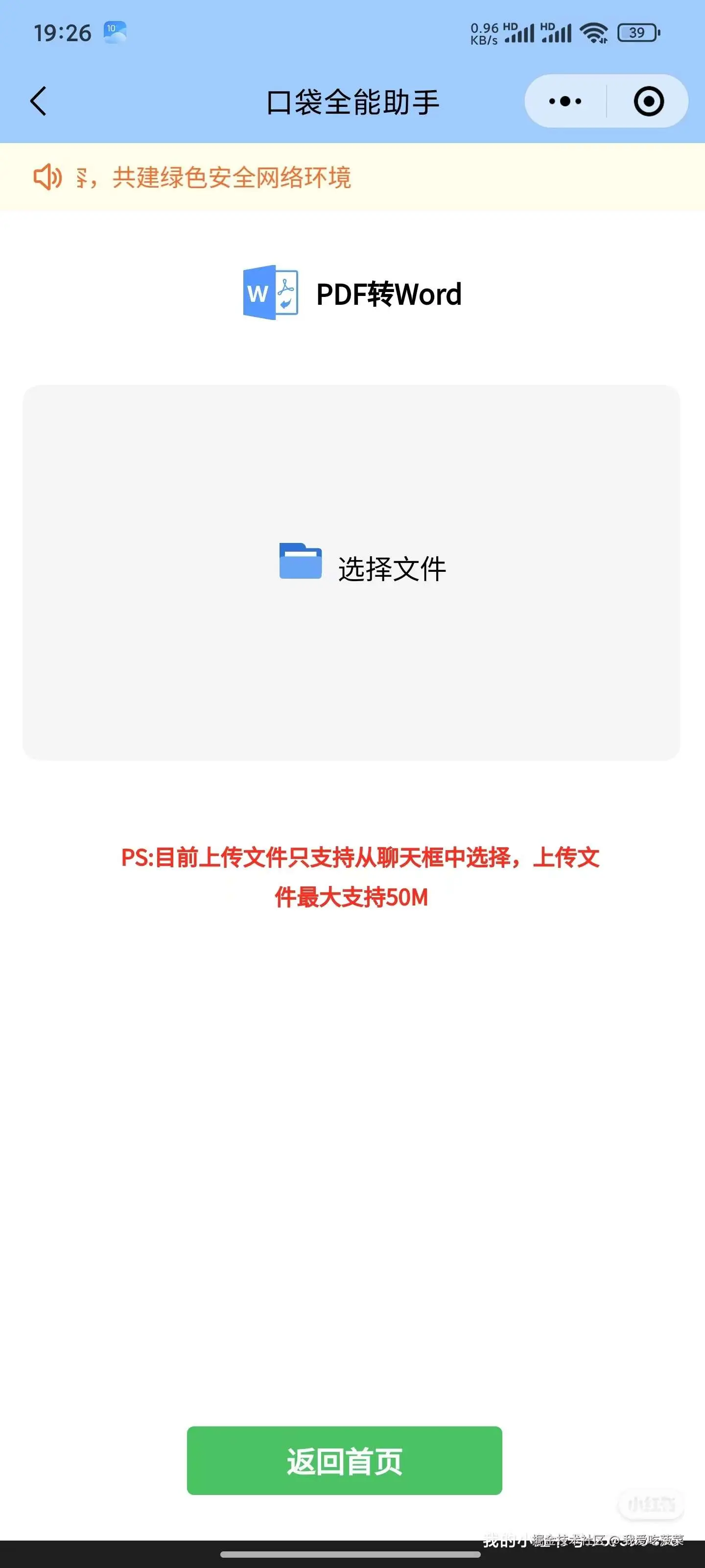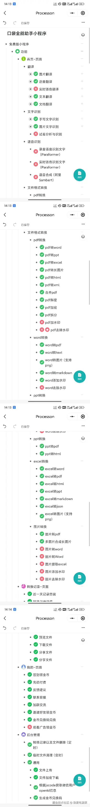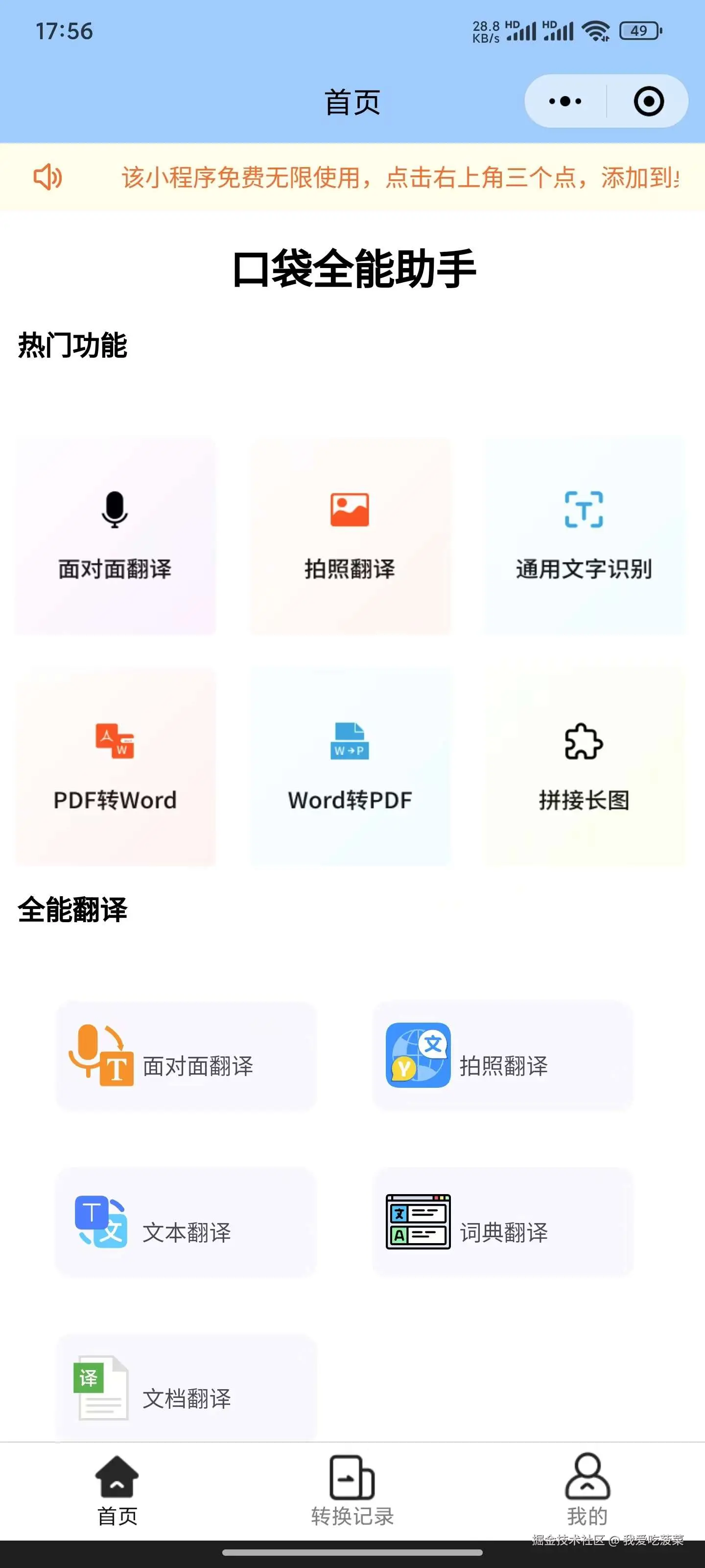 就这样一边开发一边测试,终于在11.8号这天上线了。小程序名字叫'口袋全能助手',功能有:支持图片文字扫描、语音翻译、文档翻译、PDF Word Excel PPT多种文件格式转换,给大家来几张截图。
