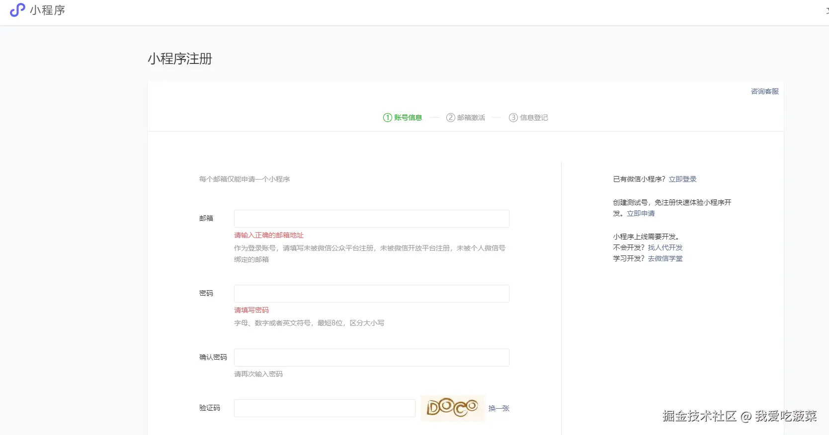 于是,我开始我的第一个小程序之路,首先了解的是微信小程序的开发流程,注册——>填写基本信息——>认证&备案——>开发小程序代码+搭建后端服务(如有)——>测试&发布小程序。