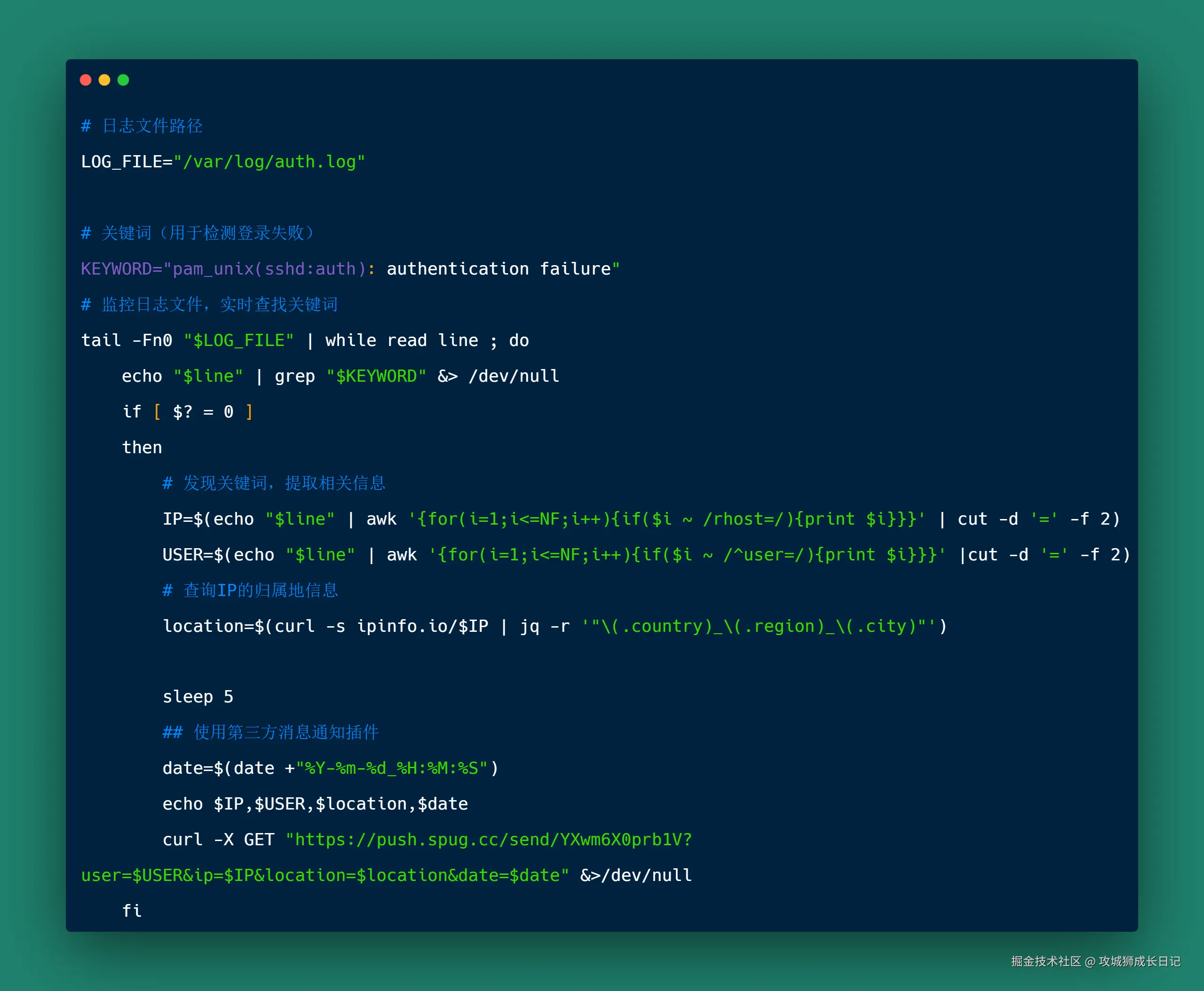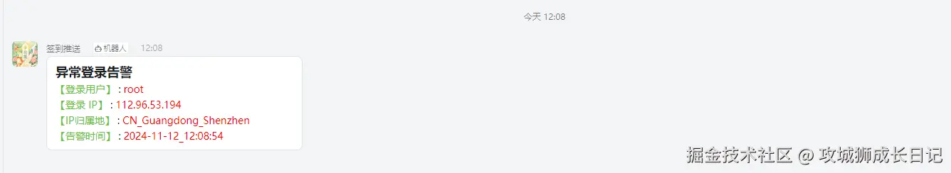 /var/log/auth.log文件。一旦发现有异常登录的情况,它会自动收集尝试登录的用户名以及该用户的IP地址。接着,它会利用ipinfo.io来查找这些IP地址的具体位置信息。最后,通过一个第三方的通知工具,比如钉钉,将这些重要信息即时发送给您,确保您可以及时了解到任何不寻常的活动。