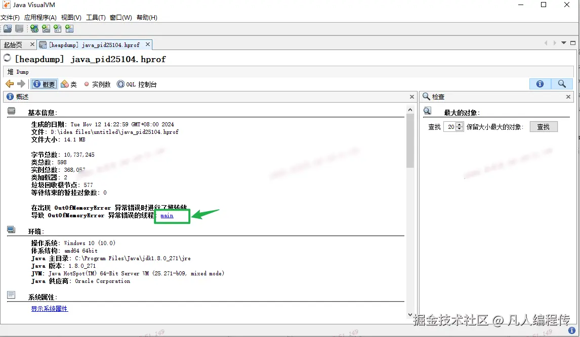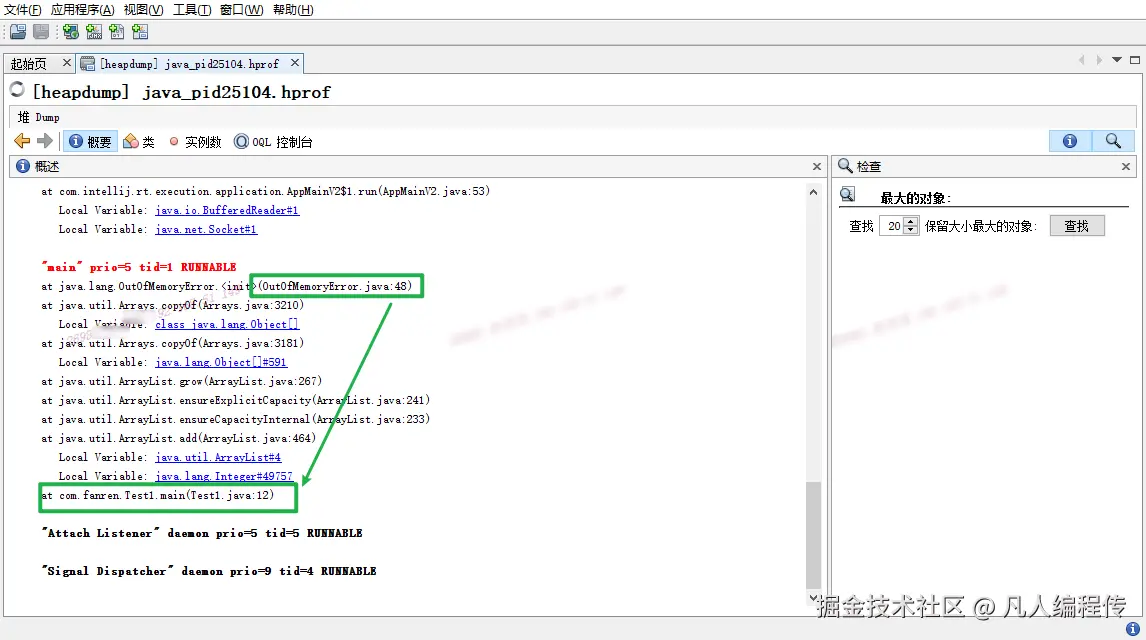 接下来我们就可以在工具中使用 java_pid25104.hprof 文件排查OOM的原因了。