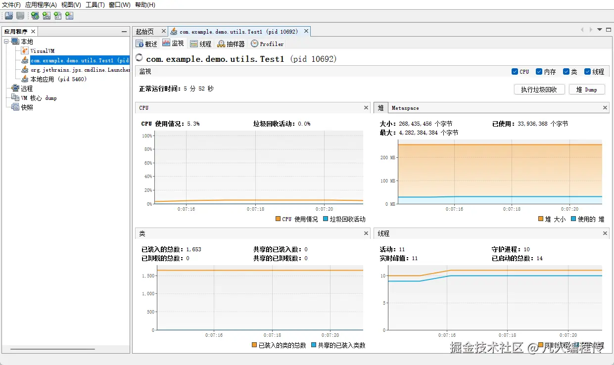 如上图,进来后如果本地有正在运行的 Java 进程,可以监控此进程,双击打开可以看到右侧也有类似于 jconsole 的监控界面。也可以在此界面执行垃圾回收或是导出(dump)当前堆的快照,非常方便。