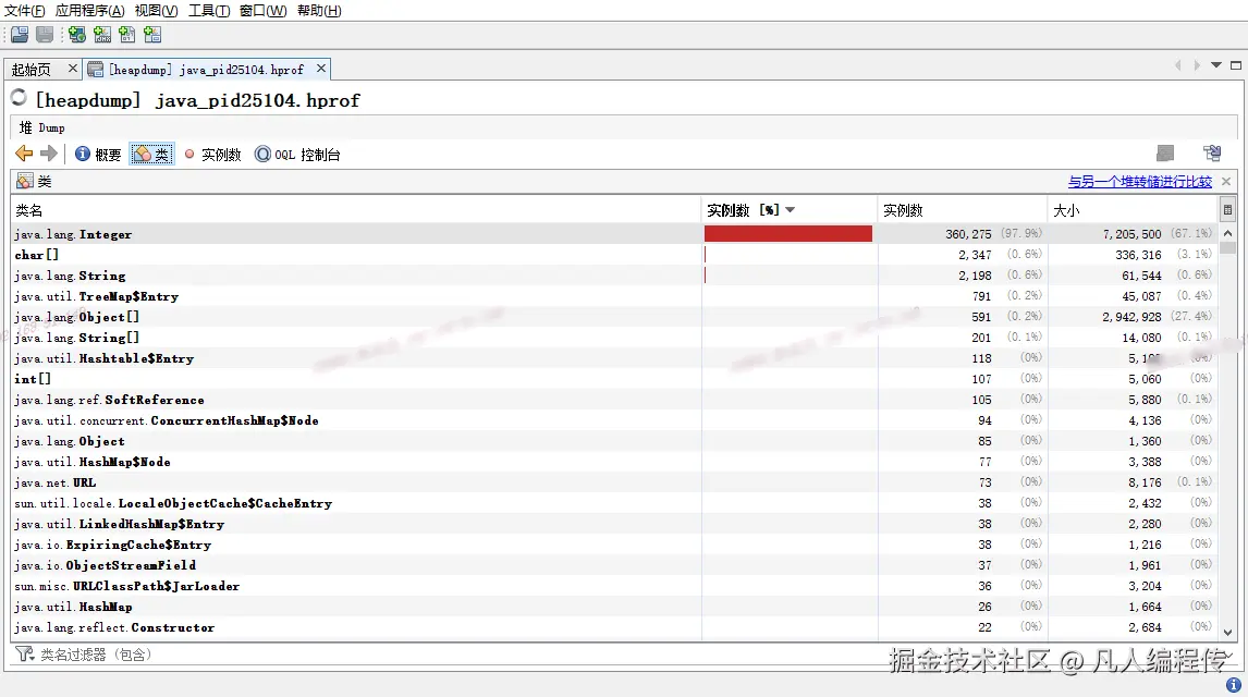 jvisualvm 不仅可以监控正在运行的进程内存状况,也可以导入内存快照。只需点击左上角的“装入快照”,我们把刚刚导出的 java_pid25104.hprof 给装入进来后如下图: