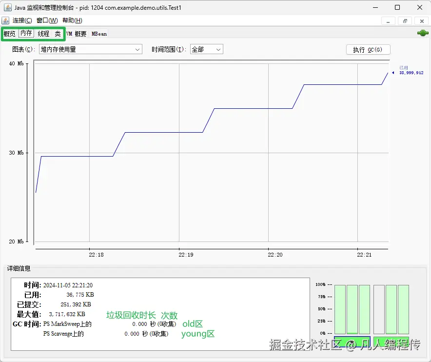 用它可以连接到正在运行的 Java 应用程序,并监视其 CPU 使用率、内存使用情况、线程状态、有无死锁、类加载等。jconsole 对于实时监控 Java 应用程序的健康状况和进行性能调优非常有用。
