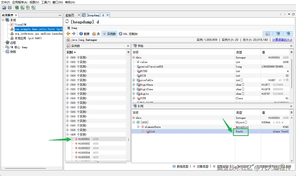 这样的话就可以得出结论:内存溢出是 Test1 类里面的 Integer 对象过多导致的。