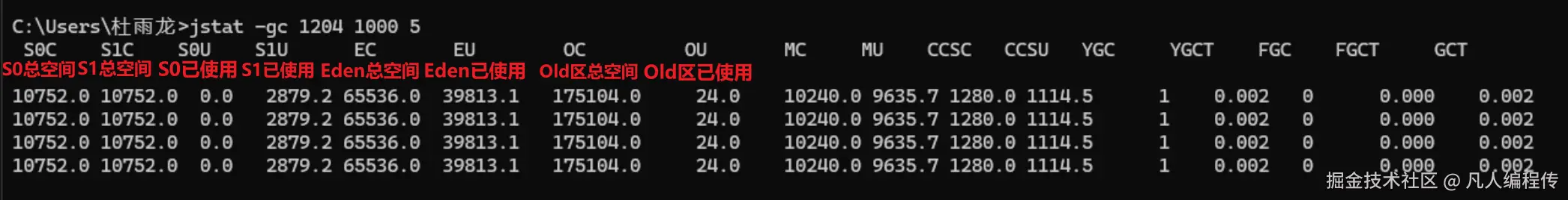 如果不想查看百分百而查看具体的值,可使用 jstat -gc 命令: