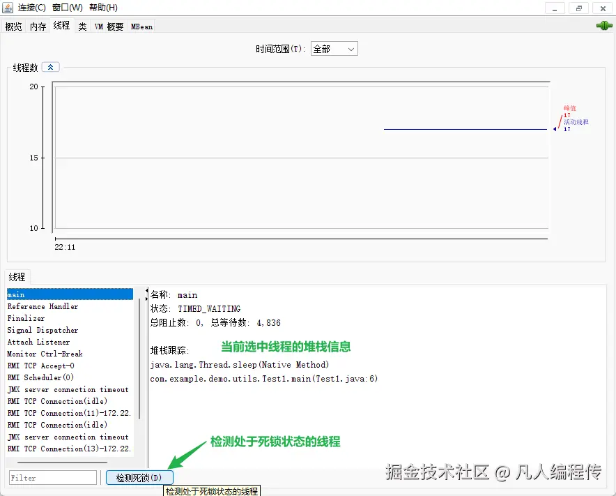 在“线程”tab页,还可以非常方便的检测当前进程有无死锁状态的线程,这也是 jconsole 最常用的功能之一。如下图:
