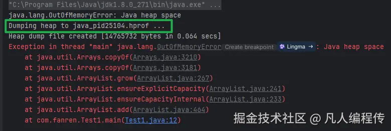 我们先创建一段代码,让它抛出OOM异常并自动导出内存快照: