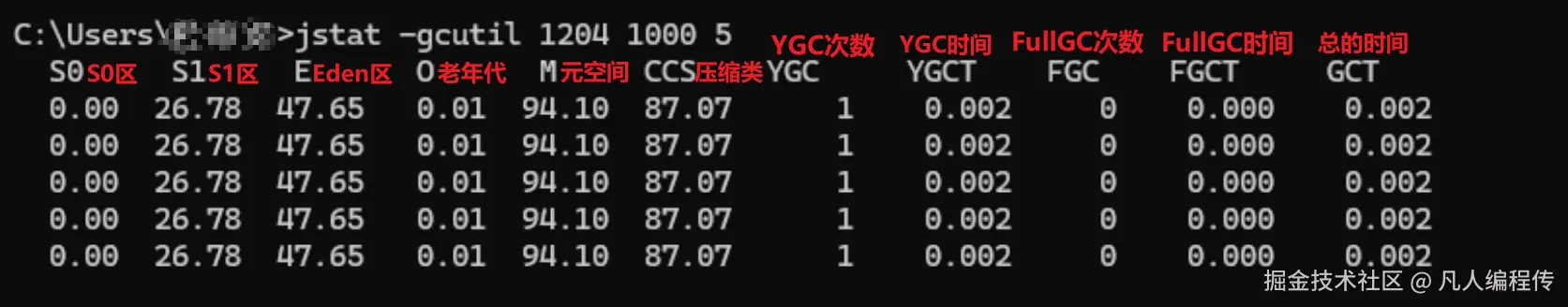 解释图中命令:jstat -gc 是查看垃圾收集情况,1204是进程号,1000是每1秒打印一次,5是一共打印5次。这里的值是百分比,S1区被占用了26.78%,Eden区被占用了47.65%。