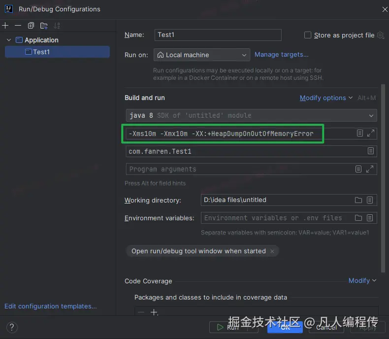 然后配置启动类,配置堆内存为10m并且发生OOM时自动导出内存快照:
