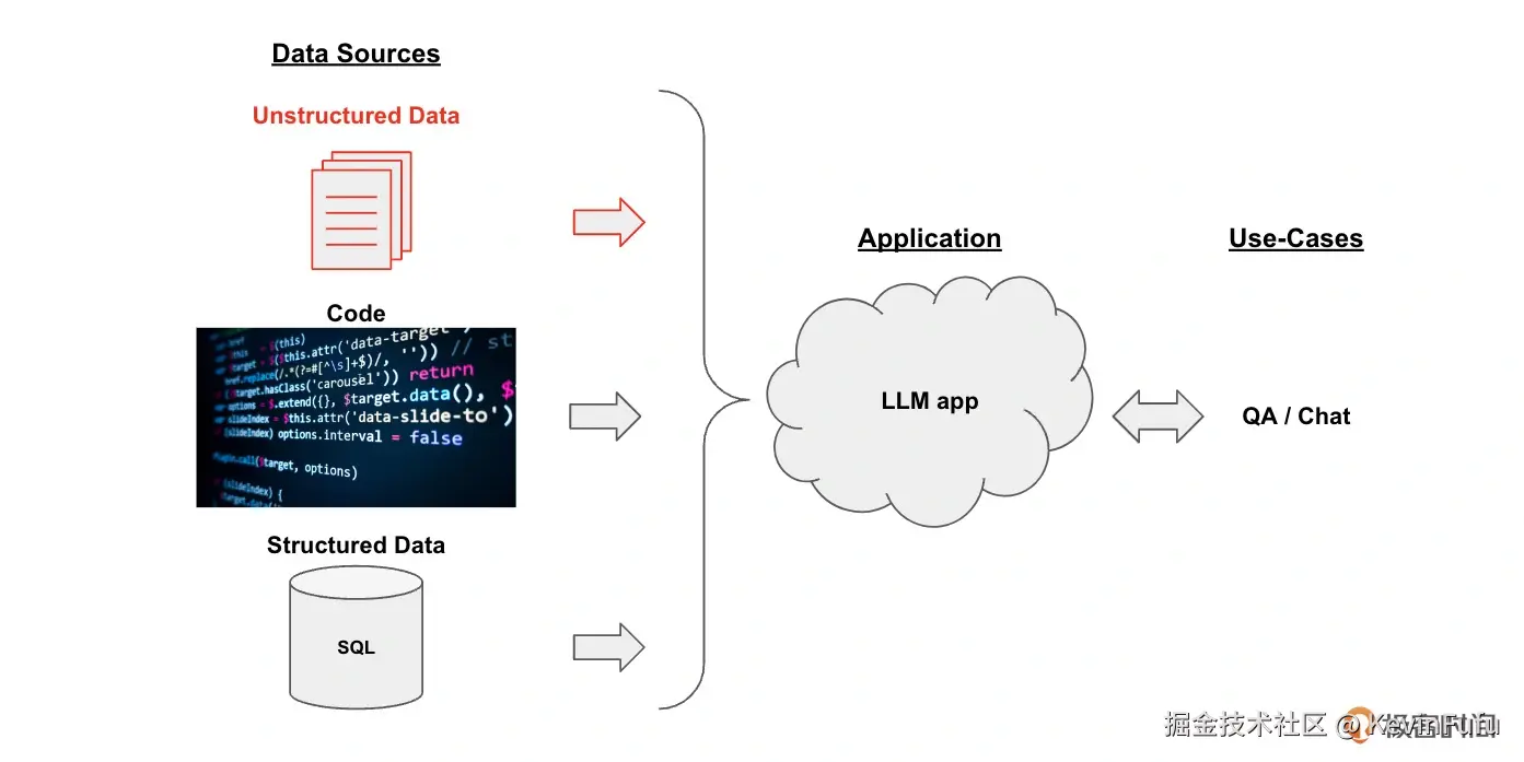 事实上,所有的以 LLM 为基础的软件都需要经历这样的过程,我们需要让我们的 LLM 程序接收到数据源,数据源不仅包括了代码和以SQL为代表的结构化数据,而且需要让处理非结构化的数据。然后,我们需要以大模型为逻辑引擎,生成我们需要的回复。最后,我们可以将大模型嵌入到实际的软件项目中,构建出聊天系统或者机器人系统。