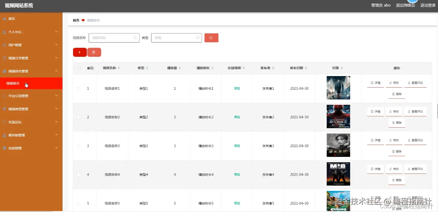 管理员管理视频排名,可以添加,修改,删除视频排名信息。下图就是视频排名管理页面。