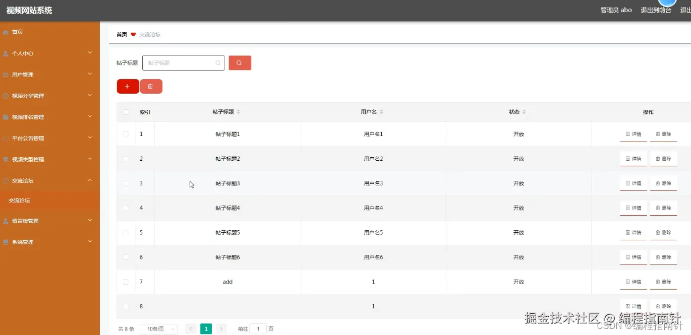 管理员管理交流论坛,可以添加,修改,删除交流论坛信息。下图就是交流论坛管理页面。