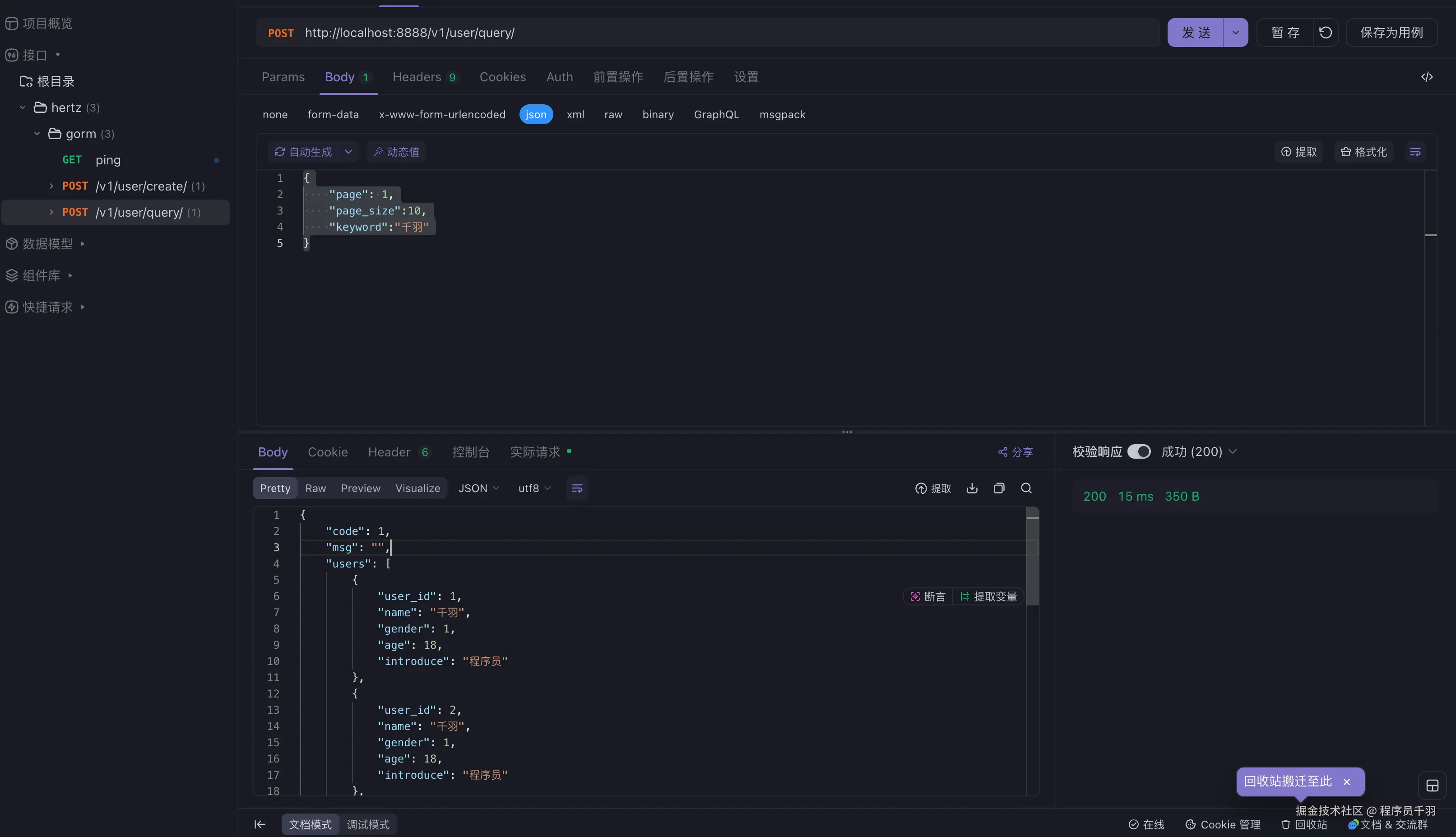 在项目启动后,我们可以逐一测试接口。Hertz 项目包含了一些基本的 CRUD 接口,方便我们进行数据的操作和验证。