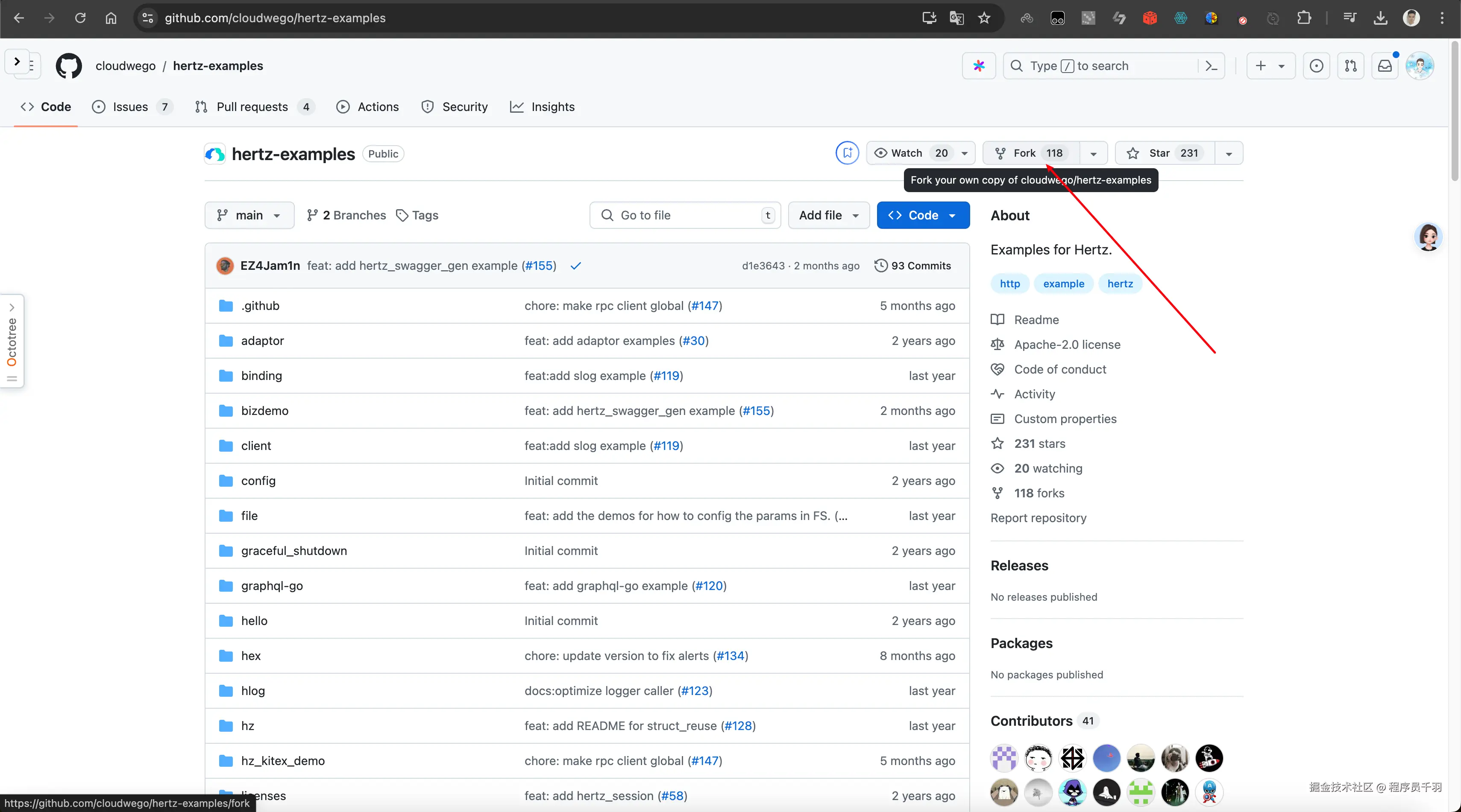 首先,将官方的 Hertz 示例仓库 fork 到自己的 GitHub 仓库,方便后续操作:
