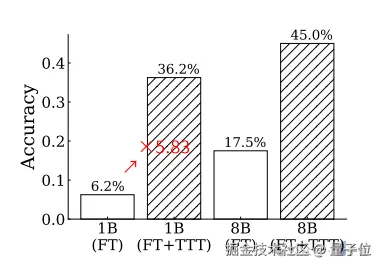 测试发现,TTT 方法对于 1B 模型的提升效果更加明显,调整后模型的准确率接近调整前的 6 倍。