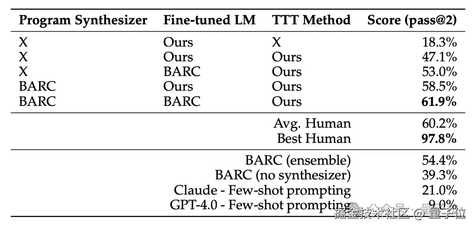 进一步地,作者还将 TTT 方法与之前在 ARC 任务上取得优异成绩的 BARC(Bootstrapping Approach for Reward model Construction)方法进行了比较和结合。