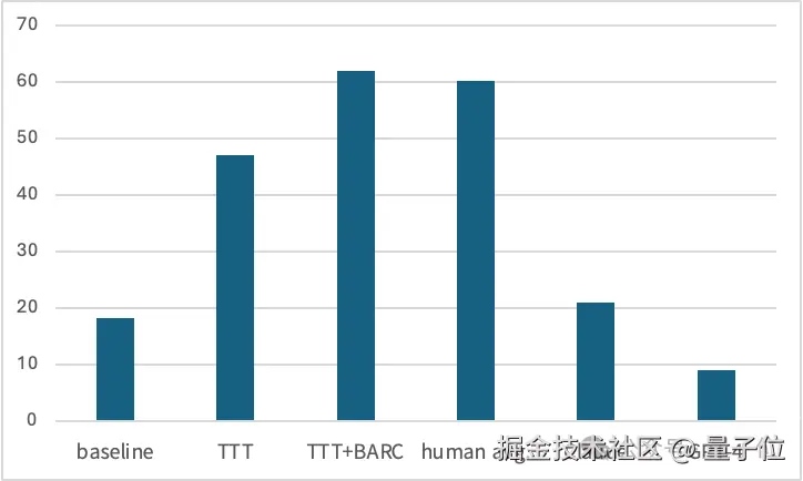如果不使用 TTT 仅进行微调,模型在 ARC 数据集上的准确率只有 18.3%,加入 TTT 后提升到 47.1%,增长率达到了 157%。