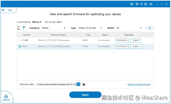 步骤3: 在“类别”选项中选择“ iPhone ”,在“类型”和“型号”选项中选择“全部”。然后找到您要安装的 iOS 版本。最后,单击“下一步”开始该过程。