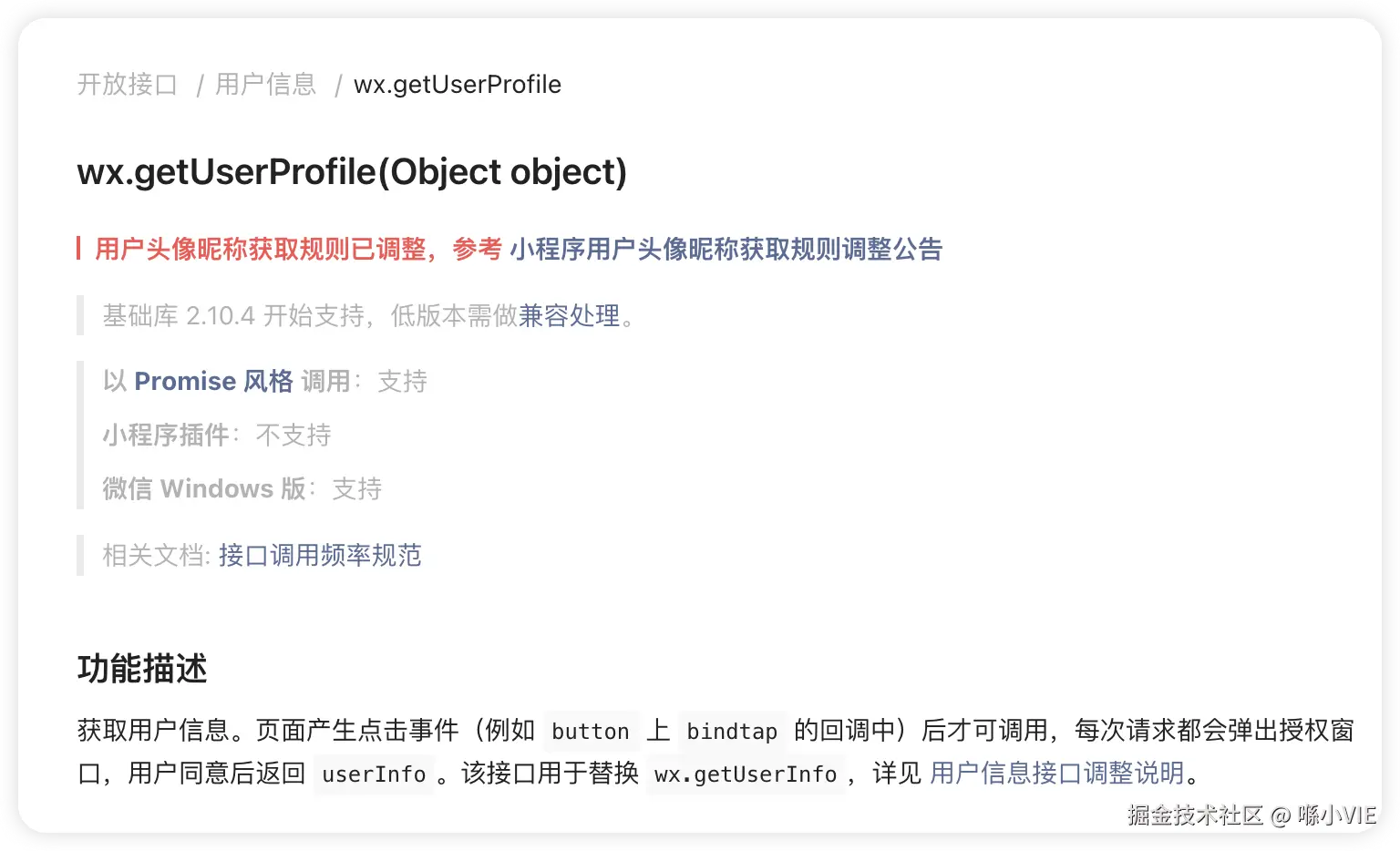 那么接下来,就是实现 “获取用户微信头像”,于是我在微信小程序 API 中找到了wx.getUserProfile用于获取用户头像昵称。