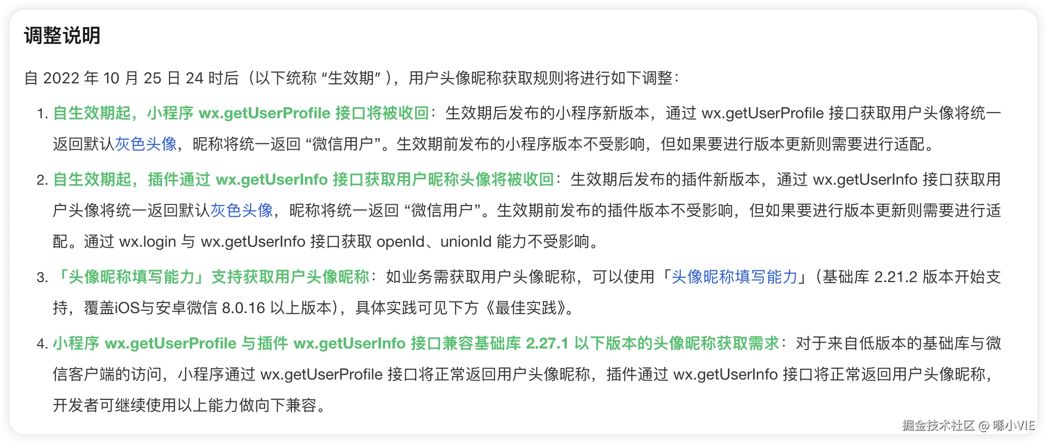 微信官方调整 API 虽然见怪不怪,但是却没想到废弃一个 API 也是想做就做。虽然在 “规则” 的调整背景中有一段话 “实践中发现有部分小程序,在用户刚打开小程序时就要求收集用户的微信昵称头像,或者在支付前等不合理路径上要求授权。如果用户拒绝授权,则无法使用小程序或相关功能。在已经获取用户的 openId 与 unionId 信息情况下,用户的微信昵称与头像并不是用户使用小程序的必要条件”,但是请问,在没有获取用户的 openId 与 unionId 信息情况下呢?