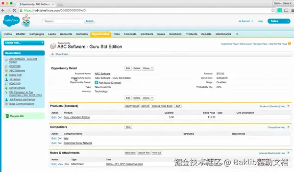 一个很好的例子是在 Baklib 中启用 Salesforce Context。我们可以帮助您将 Baklib 知识直接链接到 Salesforce 机会(或任何 Salesforce 记录)中的特定字段,这样根据销售情况,销售代表将始终拥有您掌握的所有相关知识。如下面的屏幕截图所示,Baklib 图标将显示正在推荐的内容。这是一种有用的方法,有助于养成在 Baklib 中签到的新习惯,而无需改变任何行为。
