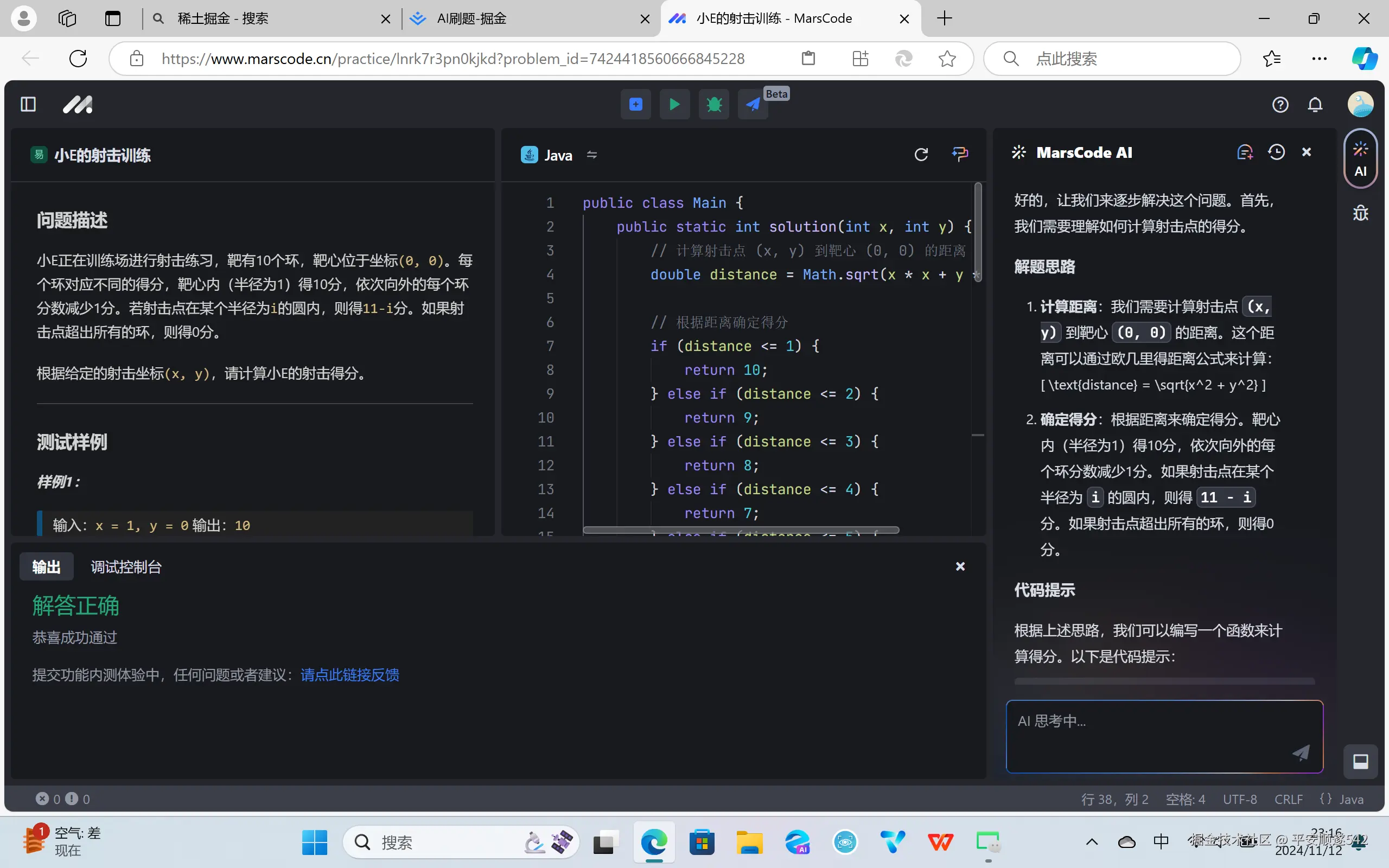 实践记录: 在这次实践中,我使用了Marcode AI平台上的Java语言练习来进行编程实践。实践的主要任务是解决小E的射击训练问题,即根据给定的射击坐标(x, y)来计算小E的射击得分。靶心有10个环,靶心位于坐标(0,0),每环对应不同的得分,靶心内(半径为1)得10分,依次向外的每个环分数减少1分。若射击点在某个半径为i的圆内,则得11-i分。如果射击点超出所有的环,则得0分。 在解决问题的过程中,我首先阅读了问题描述,理解了需要计算射击点到靶心的距离,并根据距离来确定得分。然后,我使用Java编写了一个名为Main的类,并在其中定义了一个名为solution的方法,该方法接受两个整数参数x和y,代表射击点的坐标。在方法内部,我使用欧几里得距离公式计算了射击点到靶心的距离,并根据距离的值来判断射击点所在的环数,从而得出得分。 在编写代码的过程中,我也遇到了一些问题。例如,在定义solution方法时,我忘记为第二个参数y指定类型,导致编译错误。后来,我注意到了这个问题,并修正了代码。另外,在判断射击点所在的环数时,我也需要使用一系列的if-else语句来比较距离和各个环的半径。虽然这种方法有些繁琐,但它是解决这个问题的有效方法。 最后,我成功编写出了完整的代码,并通过了平台的测试。在测试样例中,输入坐标(1,0),输出得分为10,与预期结果一致。