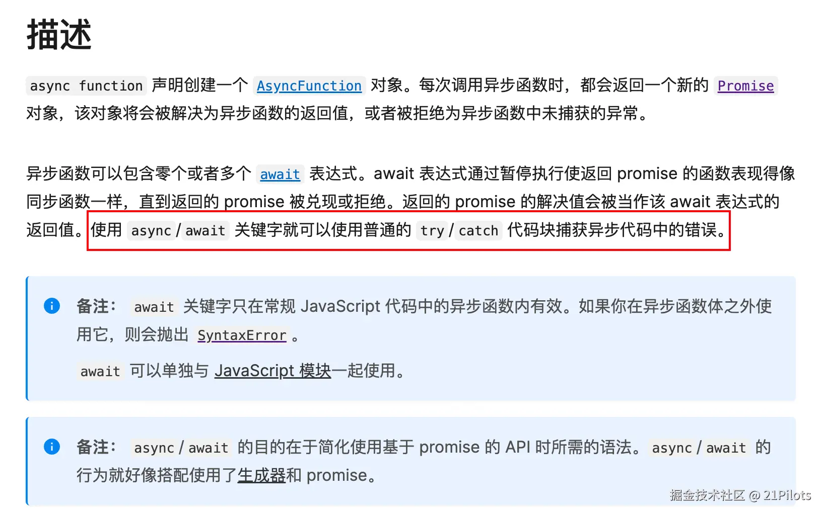 而这次不同的是,这段修改后的代码中使用了 try...catch...来捕获 async...await... 函数中的错误,这着实让我有些困惑,让我来写的话,我可能会在 await 函数的后面增加一个 catch:await asyncErrorThrow().catch(error => {})。因为我之前已经对 try..catch 只能捕获发生在当前执行上下文的错误(或者简单理解成同步代码的错误)有了一定的认知,但是 async...await... 其实还是异步的代码,只不过用的是同步的写法,为啥用在这里就可以捕获到错误了呢?在查阅了相当多的资料之后,才清楚了其中的一些原理。