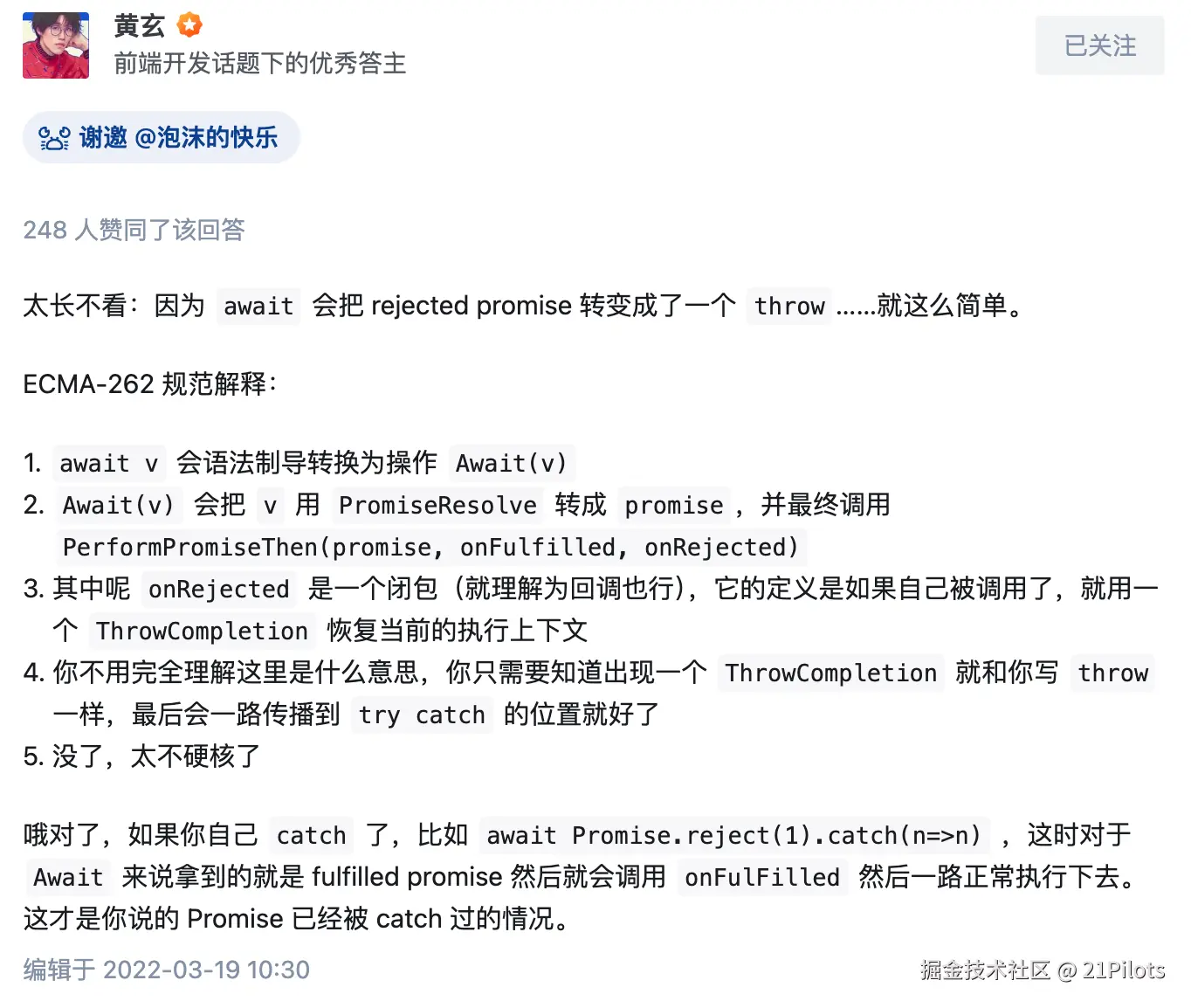这...难道就是浏览器底层帮我们处理的事儿吗,不然也没法解释了。唯一能够解释的事就是,async await 原本就是为了让开发者使用同步的写法编写异步代码,目的是消除过多的 Promise 调用链,我们在使用 async await 时,最好就是不使用 .catch 来捕获错误了,而直接能使用同步的 try...catch... 语法来捕获错误。即使 .catch 也能做同样的事情。只是说,代码编写风格统一性的问题让我们原本能之间用同步语法捕获的错误,就不需要使用 .catch 链式调用了,否则代码风格看起来会有点“异类”。