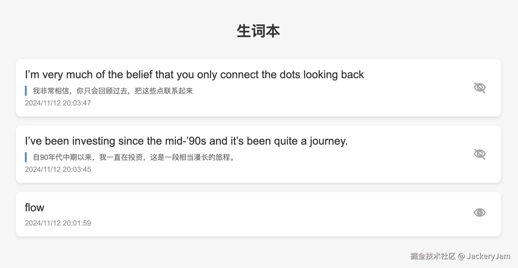 - 该页面按时间帮我列出单词和中文,每一项都有一个小眼睛的按钮,点击按钮后出现中文,好让我复习