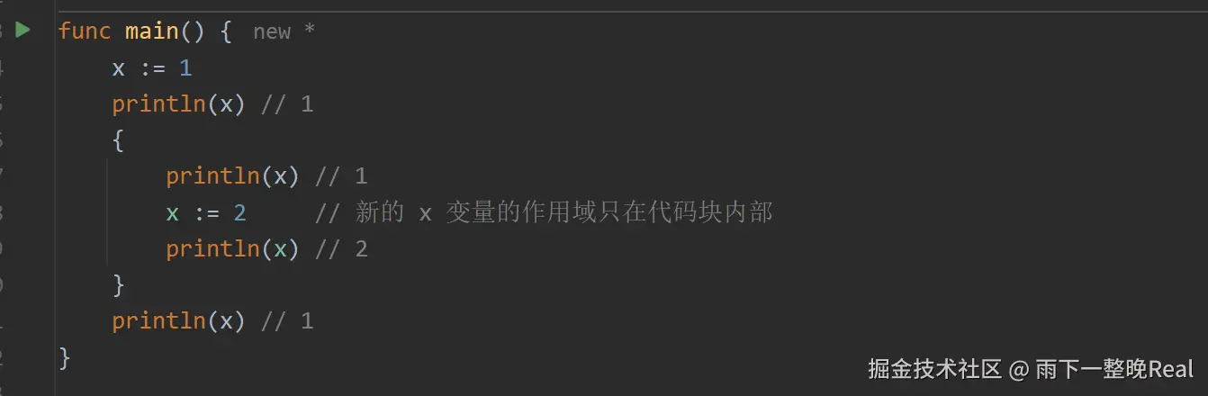 :=一个同名的已有的变量,仅会在新的作用域下生效,即简短声明并不等于赋值。常用的 IDE 通常也会给出Declaration of 'x' shadows declaration at xxx.go的提示。
