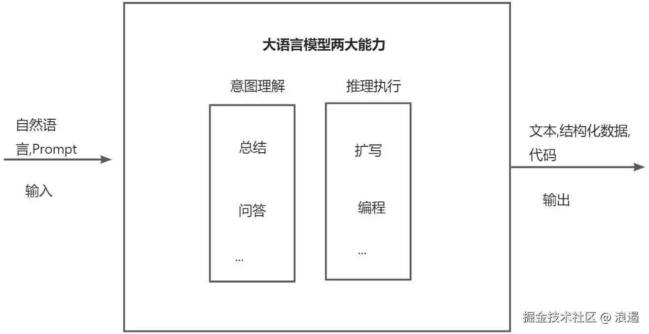 从图中可以看出,我们可以将大语言模型抽象成一个包含输入、处理 和输出的系统。在这个系统中,输入可以是自然语言或者一个特定明确的提示(Prompt)。经过大语言模型处理后的输出,可以是