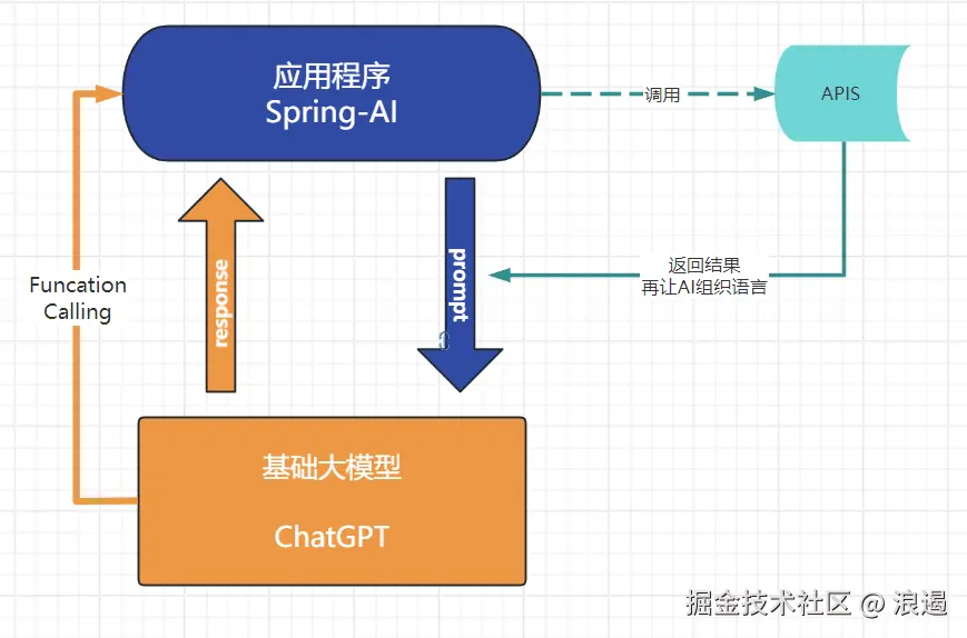 如下图: 调用天气的 Api , 获取的结果 和 Prompt 一起交给基础大模型处理,得到的结果在返回给应用程序,
