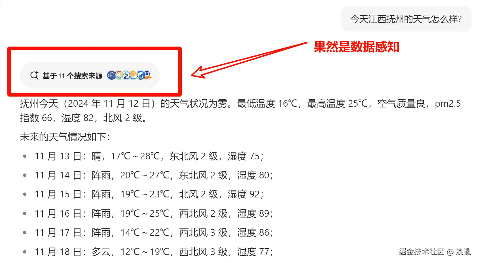 天气这种东西, 的确具有实时性! Ai 不可能预先知道,因为大模型是提前训练好的。就像大学生点的外卖可能是预制菜, 不可能是新鲜的🐶。
