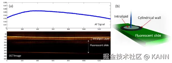 文章来源:H. Pahlevaninezhad , A. M. D. Lee , C. Hyun - Spie Bios – 2013 Proc. of SPIE Vol. 8565 85652S-2 本文以实验结合光学软件FRED来验证荧光介质上覆盖散射层的影响,结合AF-OCT系统能够减少由于上皮组织增厚引起的假阳性,增强AF疾病检测的功效。 摘要: 在本文中,我们通过模拟组织的自发荧光(AF)特性进行了模型的研究。我们组合了光学相干断层扫描(OCT)和AF成像系统,依据散射层的厚度和浓度来测量AF信号的强度。使用由生成的OCT图像计算得到的厚度和散射浓度,结合AF-OCT系统能够估计由上皮组织散射引起的AF损耗。我们定义了一个校正因子来计算上皮组织中的散射损耗,并且计算了一个校正散射AF信号。我们认为校正散射AF将会减少在早期呼吸道病变检测中的诊断误检率,误检是由混合因子产生,如增加的皮层厚度和炎症。 关键词:光学相干断层扫描;自发荧光;光散射;模型;光线光学;OCT A-line数据 1. 简介自发荧光(AF)成像是一项已实现的技术,使用蓝光来激发自然组织荧光。通过收集高风险区域进行活检识别,已经证明这项技术对于癌症的早期检测和癌的分期是及其有效的。虽然通过白光成像可以容易的检测浸润癌,原位癌和高度的癌前病变的检测却十分棘手。白光成像中的变化十分微小,然而,AF成像可以清楚地对比这种病变。当受到蓝光照射时,正常的组织会发出强烈的绿色AF,而异常组织则缺少这种AF辐射。尽管AF成像可以方便的检测原位癌,对于良性组织的异常现象也是十分敏感的。例如,上皮组织的厚度未必就与癌症相关,但是它确实减少了由散射产生的AF信号,导致了假阳性。因此,将癌症与其他非危险异常现象区别开来可以极大地增加治疗的疗效。光学相干断层扫描(OCT)是可以获得生物组织皮下图像的一项相干技术,它可以提供小于10μm轴向分辨率和大约3mm穿透深度的图像。OCT采用了非电离,通常是近红外的辐射来捕获组织形态的实时图像。OCT可以用于研究高风险的组织位置。因此,当用于组合时,以一种同时和协作的形式,AF-OCT成像可以提供丰富的生化信息,并定位组织形态,这些不能通过单独的成像模式获得。比如,在上皮组织增厚的情况下,OCT可以直接测量上皮组织厚度,并且将AF信号衰减归因于上皮增厚,而不是癌症前期引起的胶原重建。因此,由OCT给定结构信息,并结合AF-OCT可以减少AF假阳性。AF信号强度不仅取决于原位的荧光,也取决于不同组织层的光吸收和散射。组织的光散射已经经过了深入的研究1-6。模拟组织散射可以提供与AF信号强度有价值的信息。由于价格低廉、方便校准且易于获得,英脱利匹特(Intralipid)是用于组织模型最常见的散射媒介。这项工作的目的是根据散射层的厚度模拟组织自发荧光的性质。我们定义了一个AF信号校正因子,用来说明散射层引起的损耗。OCT图像给出了散射层厚度和散射颗粒的浓度,这是校正因子计算所需的两个因素。因此,我们提出了AF-OCT系统,作为癌症检测的一个更灵敏和精确的成像工具。首先,我们解释了Intralipid模型研究,旨在模拟不同上皮厚度的组织散射特性。然后,使用光线光学仿真来验证实验结果。使用AF和OCT数据计算AF校正因子将在最后一章解释。 2. 实验步骤我们建立了一个能够结合OCT和AF成像的双态成像系统,OCT图像测量Intralipid膜的厚度和浓度,AF图像给出相应的AF信号强度。因此,AF-OCT成像可以映射不同浓度下AF强度和Intralipid厚度的关系。OCT光激发使用一个30mW基于多边形扫描仪的扫描波长的激光光源,具有106.8nm的带宽,中心波长为1321.4nm。 激光光源为一个基于光纤的具有参考臂和样品臂的马赫泽德干涉仪(MZI),如图1所示(OCT部分)。平衡的光电探测器(ThorLabs)检测干涉。另一个MZI单元在光源处使用,来产生样品的参考时钟。探测器输出和MZI时钟注入到数字转换器卡(AlazarTech)中,实现信号处理和创建OCT图像。AF成像系统使用一个40mW的半导体激光器(相干),在446nm处激发荧光。使用两个1英寸直径的透镜和一个基于APD的探测器(Hamamatsu)来收集再发射的AF光子。二向色性的滤波片从AF光子中分离出后向散射的蓝光,如图1所示(AF部分)。通过在自由空间的背面抛光宽板电介质反射镜(ThorLabs),OCT和AF光信号可以实现结合和分离。电流扫描镜提供了样品AF和OCT光束共同的2维扫描。 图1.AF-OCT成像系统 我们的模型,如图2(b)所示,包括一个直径为1英寸的薄(1mm高)圆柱壁,它安装在一个荧光载玻片上,以及圆柱壁中包围着的Intralipid液体。改变容器中Intralipid的量会产生不同的Intralipid膜厚度,由OCT图像测得。选择封闭的圆柱壁时,高度要低,直径要大,这样就可以得到小的Intralipid膜厚度(μm范围),同时在容器的中心区域可以接近扁平的表面以避免半月板和透镜效应。图2(a)显示了在荧光载玻片上Intralipid膜的AF信号和OCT图像。Intralipid膜的厚度和相对应的AF信号可以从图中容易地获得。 图2.(a)在荧光载玻片上Intralipid膜的AF信号和OCT图像,(b)Intralipid模型由在荧光载玻片上的圆柱壁及其中包含的Intralipid组成。 3. 光线光学仿真使用来自Photon Engineering公司的商业软件包FRED,我们将实验的结果与光线光学仿真的结果进行比较。图3显示了仿真的配置和组件,包含一个蓝色的激光光源(446nm)、一个荧光载玻片、一个Intralipid膜、用于聚焦蓝光到样品上和收集重新发射的AF光子的1英寸透镜(焦距40mm)、一个远离透镜50cm的探测器,模仿实验的装置。探