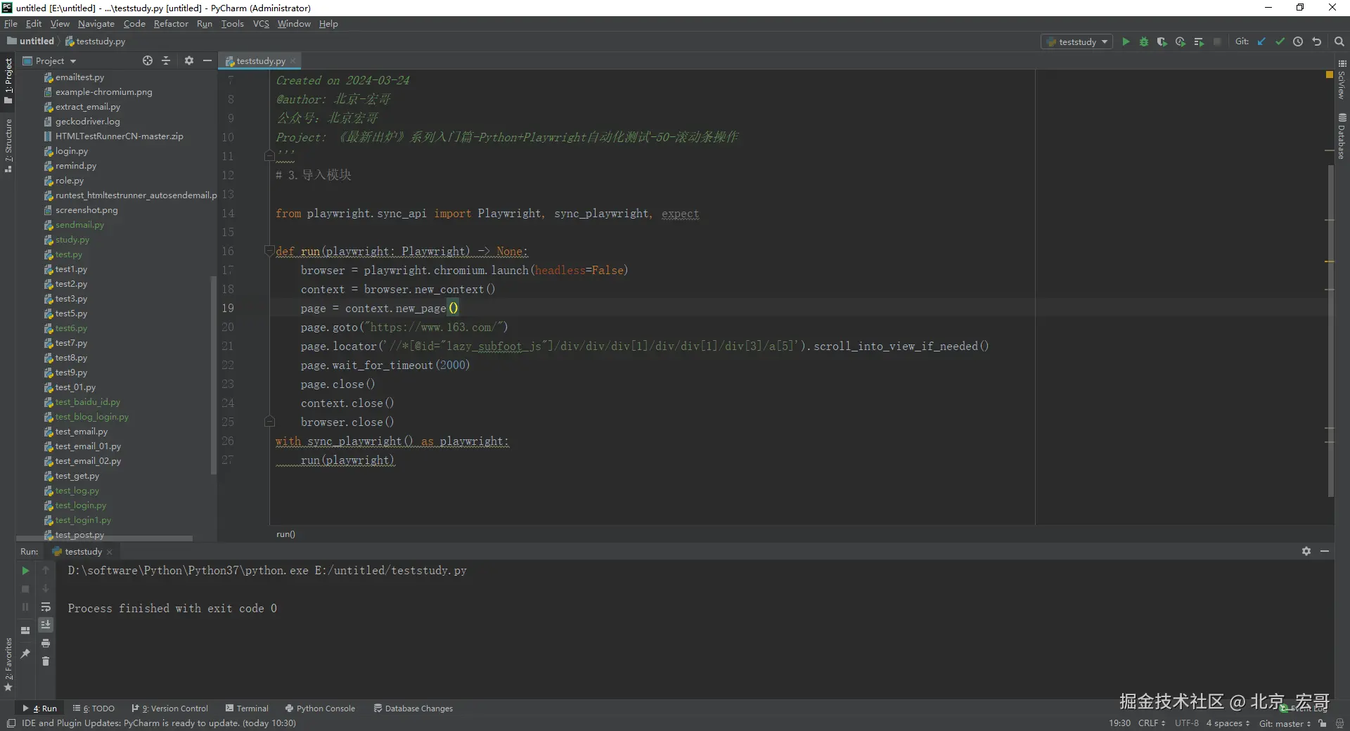 2.运行代码后电脑端的浏览器的动作(宏哥的滚动条的位置设置的值比较大,所以滚动到底部)。如下图所示: