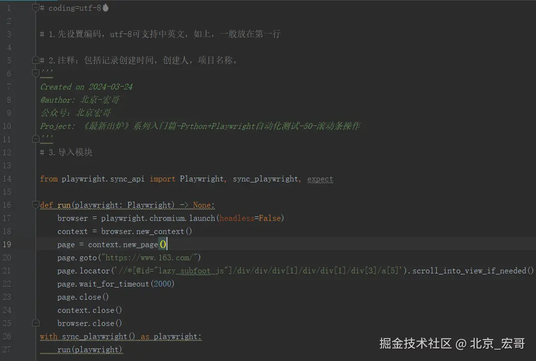 当页面比较长,超过浏览器的高度时候,有些元素虽然没有显示,但是实际已经加载到页面上了,只是因为滚动条未滚动至下面,所以看不到。在Chrome中可通过F12调试查看页面元素。而不是元素根本就没有,当滚动时才延迟加载。是可以直接操作的,而且playwright 在点击元素的时候,会自动滚动到元素出现的位置,这点是非常人性化的。但有些元素需要滚动到元素出现的位置,让元素处于可视的窗口上才能去操作。 或者网站是通过上拉加载的方式请求接口实现翻页的,这个时候就需要控制滚动条实现向下拖动,实现翻页的功能。Playwright提供了scroll_into_view_if_needed()方法,可以控制滚动条滚动到元素显示的位置。可使用此种方式。达到以操作滚动条的目的。