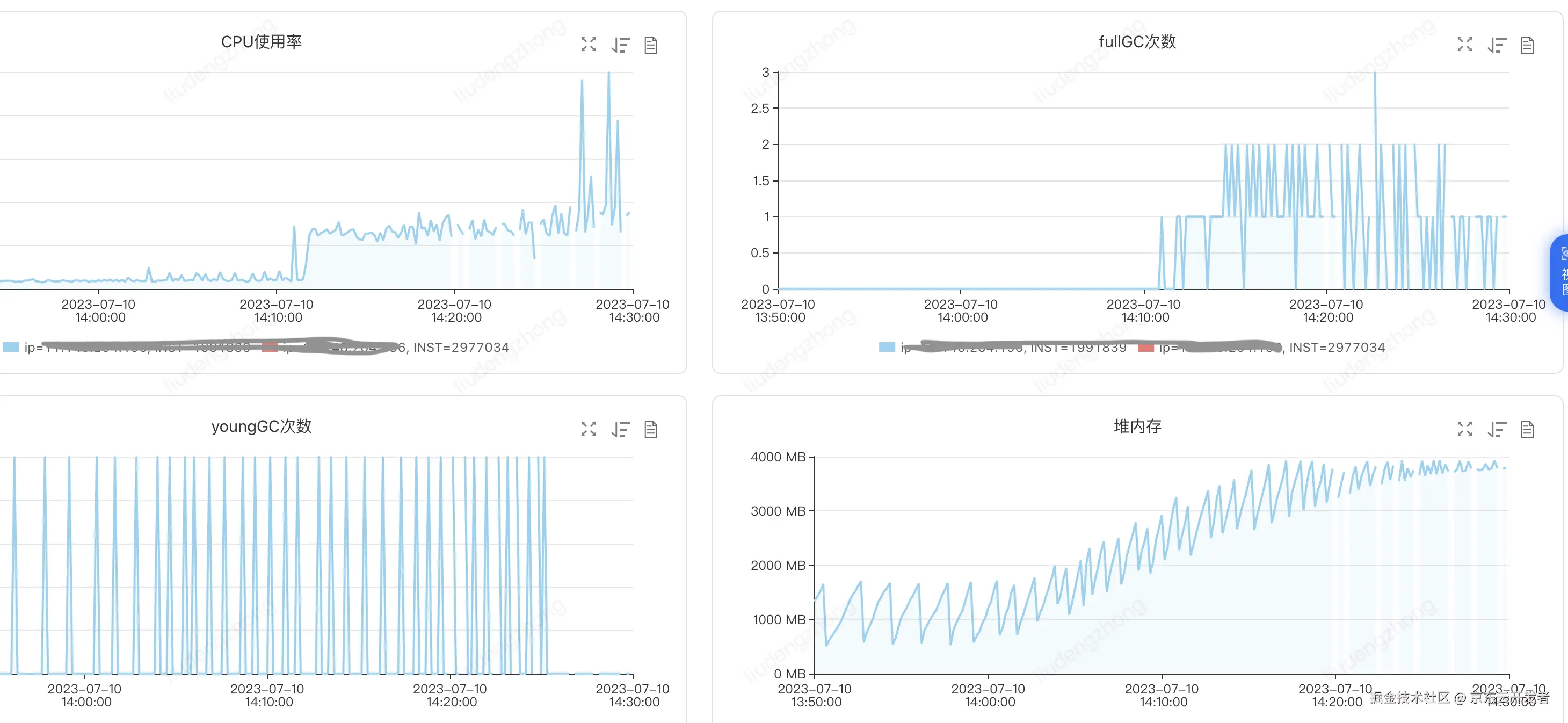 通过查看PFinder发现内存一直在增长,没有停止迹象,触发fullGC也并没有下降趋势: