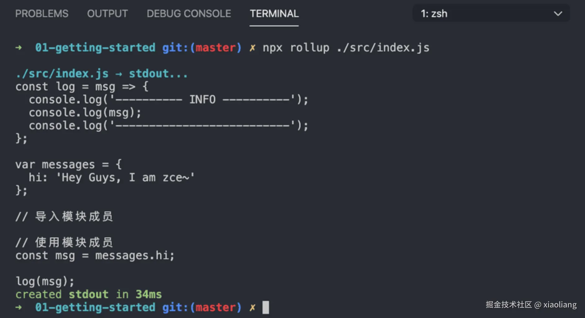 $ npx rollup ./src/index.js --file ./dist/bundle.js
