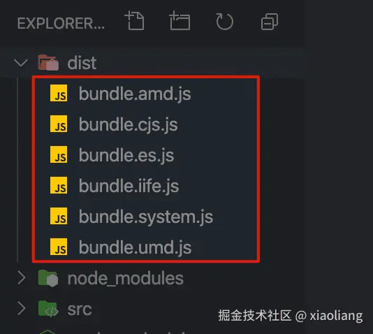 配置完成之后,我们回到命令行终端,再次运行 Rollup 打包。那这次打包过后,dist 目录下就会生成不同格式的输出结果,如下图所示: